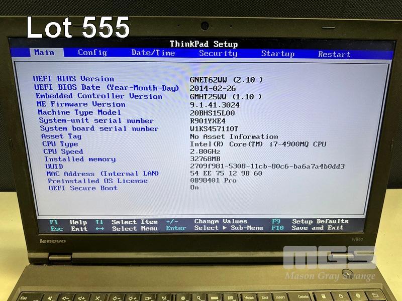 LAPTOP, LENOVO THINKPAD W540, TYPE 20BH, CORE i7 4900MQ (4TH GEN) @ 2.8GHz, 32GB DDR3 RAM, 256GB SSD, 500GB SATA HDD, 15.6" WIDESCREEN (1920x1080), INTEL HD VIDEO, 2GB NVIDIA QUADRO K1100M VIDEO, Wi-Fi, BLUETOOTH, WINDOWS 10 PRO INSTALLED (NO POWER SUPPLY) (NOTE: BRIGHT SPOTS CORNERS OF SCREEN, MINOR MARKS ON SCREEN) S/N:R901YXE4