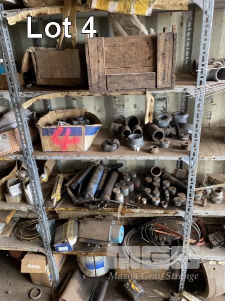 CONTENTS OF 5 BAYS SHELVING, GALV PIPE FITTINGS, PIPE CLAMPS, VALVES, V BELTS, HARDWARE INCLUDING NUTS & BOLTS ETC. GREASE GUNS, PYROMETER SENSORS & MORE!
