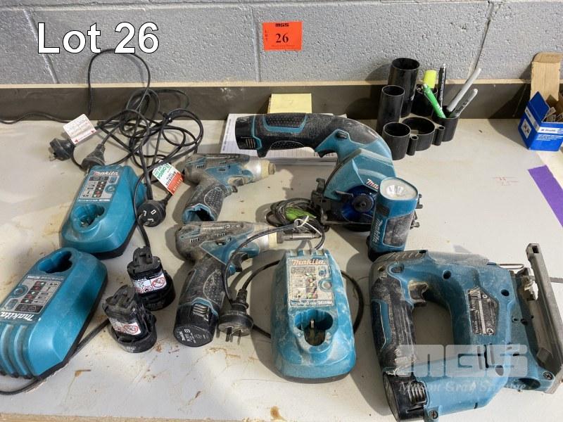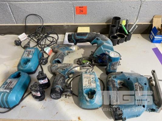 ASSORTED CORDLESS MAKITA TOOLS INCLUDING, 3 x CHARGERS, JIGSAW, CIRCULAR SAW, LIGHT, 5 x BATTERIES, 10.8V