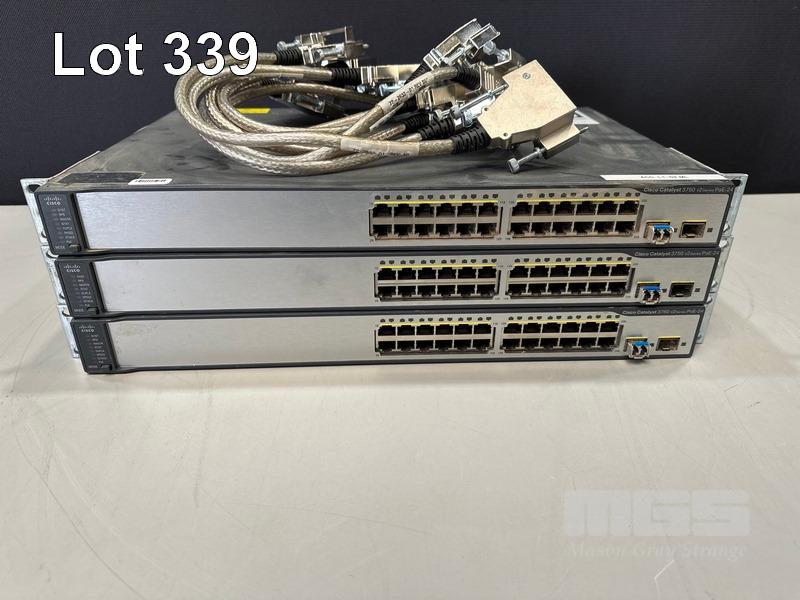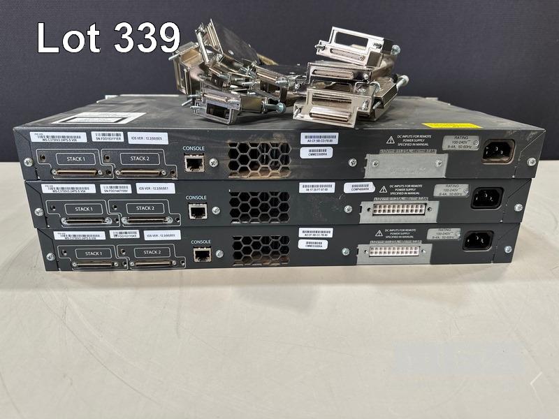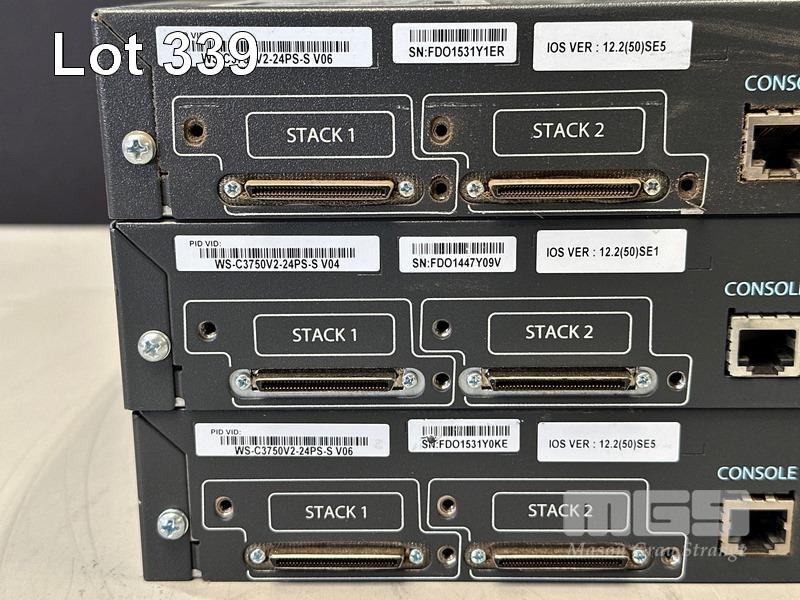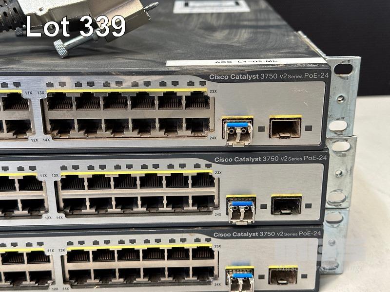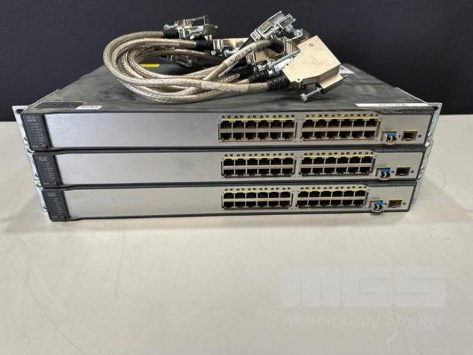 3 x CISCO CATALYST 3750 V2 SERIES PoE-24 PORT SWITCHES, WS-C3750V2-24PS-S WITH STACKING CABLES S/N:FDO1531Y1ER, FDO1447Y09V, FDO1531Y0KE