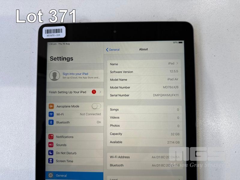APPLE iPAD AIR, 32GB, Wi-Fi, SPACE GREY, MODEL A1474, MD786X/B (NO CABLE, NO CHARGER) S/N:DMPQWKMUFK11