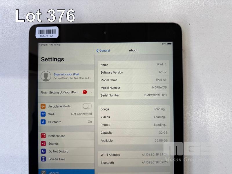 APPLE iPAD AIR, 32GB, Wi-Fi, SPACE GREY, MODEL A1474, MD786X/B (NO CABLE, NO CHARGER) S/N:DMPQX2CFFK11