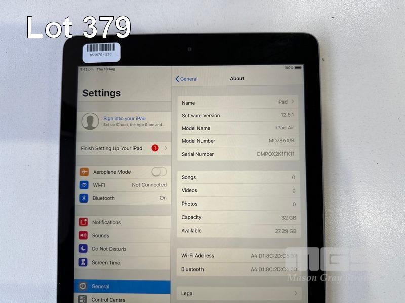 APPLE iPAD AIR, 32GB, Wi-Fi, SPACE GREY, MODEL A1474, MD786X/B (NO CABLE, NO CHARGER) S/N:DMPQX2K1FK11