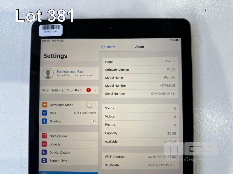 APPLE iPAD AIR, 32GB, Wi-Fi, SPACE GREY, MODEL A1474, MD786X/B (NO CABLE, NO CHARGER) S/N:DMPQX1HDFK11
