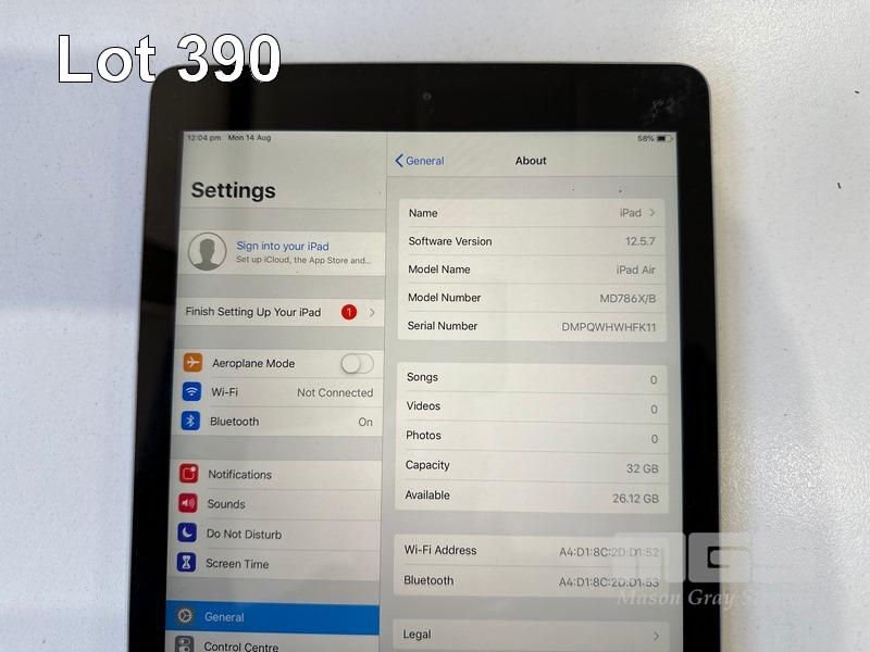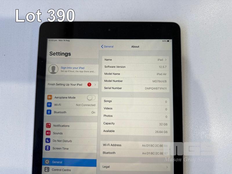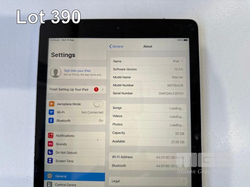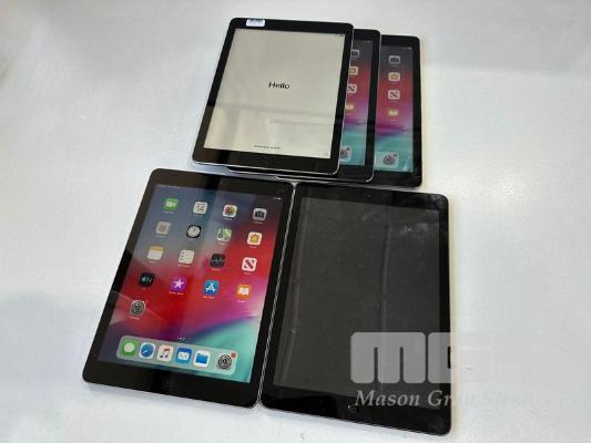 5 x APPLE iPAD AIR, 32GB, Wi-Fi, SPACE GREY, MODEL A1474, MD786X/B 1 x APPLE iPAD 2, 16GB, Wi-Fi. MODEL A1395 (NO CABLES, NO CHARGERS) (NOTE: 2 x LOCKED TO iCLOUD, SOME WITH MARKS ON SCREEN / DAMAGE, 1 x DEAD) S/N:DMPQWHVLFK11, DMPQWBT1FK11, DMPQWLFZFK11, DMPQWHWHFK11, DMPQX1D5FK11, DYTKKS0QDFHW