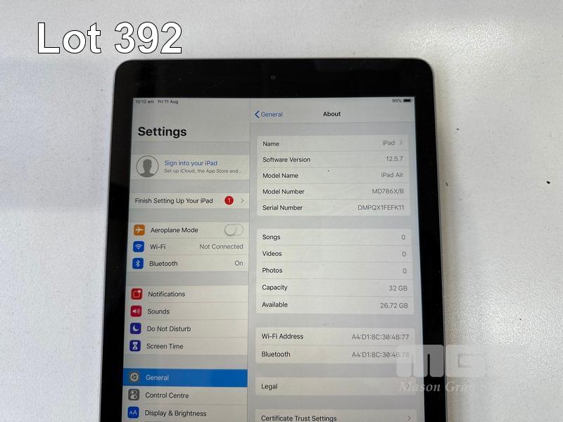 6 x APPLE iPAD AIR, 32GB, Wi-Fi, SPACE GREY, MODEL A1474, MD786X/B (NO CABLES, NO CHARGERS) (NOTE: ALL VARIOUS CRACK LINES ON SCREEN) S/N:DMPQX2UCFK11, DMPQX2SBFK11, DMPQWH7TFK11, DMPQWAC1FK11, DMPQX313FK11, DMPQX1FEFK11