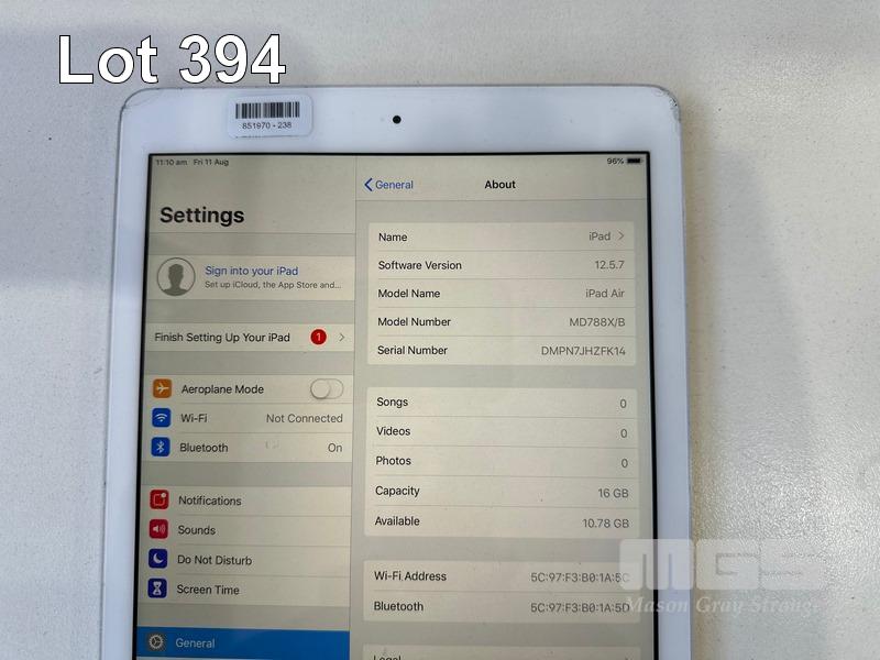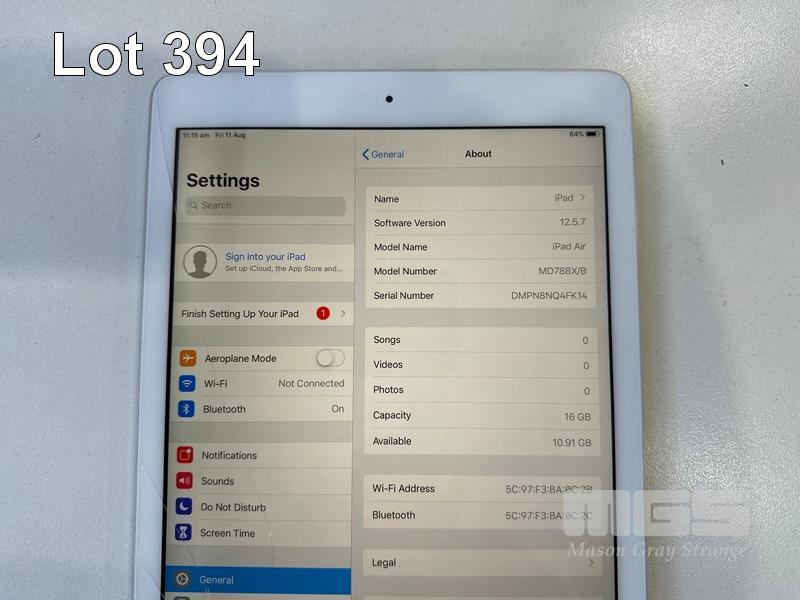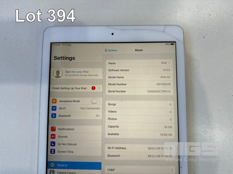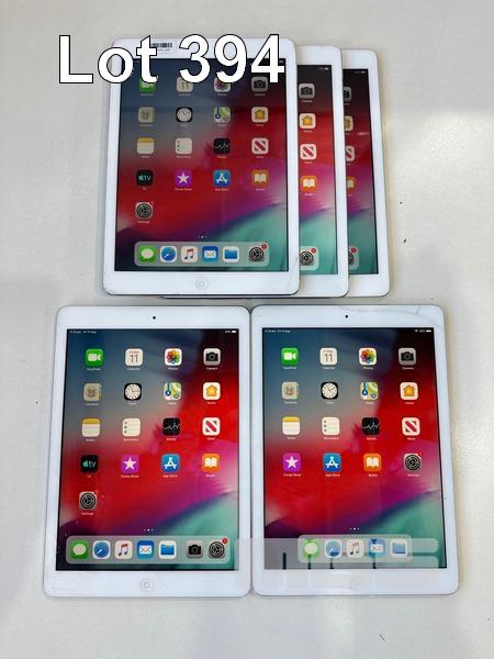 5 x APPLE iPAD AIR, 16GB, Wi-Fi, SILVER, MODEL A1474, MD788X/B (NO CABLES, NO CHARGERS) (NOTE: ALL VARIOUS CRACK LINES ON SCREEN) S/N:DMPN7JHZFK14, DMQN2UJTFK14, DMPN77BBFK14, DMPN8NQ4FK14, DMQMWC78FK14