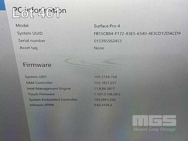 TABLET PC, MICROSOFT SURFACE PRO 4, MODEL 1724, CORE i5 6300U (6TH GEN) @ 2.4GHz, 8GB RAM, 256GB SSD, 12.3" TOUCHSCREEN (2736x1824), INTEL HD GRAPHICS 520, Wi-Fi, BLUETOOTH, WINDOWS 10 PRO INSTALLED, KEYBOARD TYPE COVER, STYLUS & POWER SUPPLY S/N:015395562453