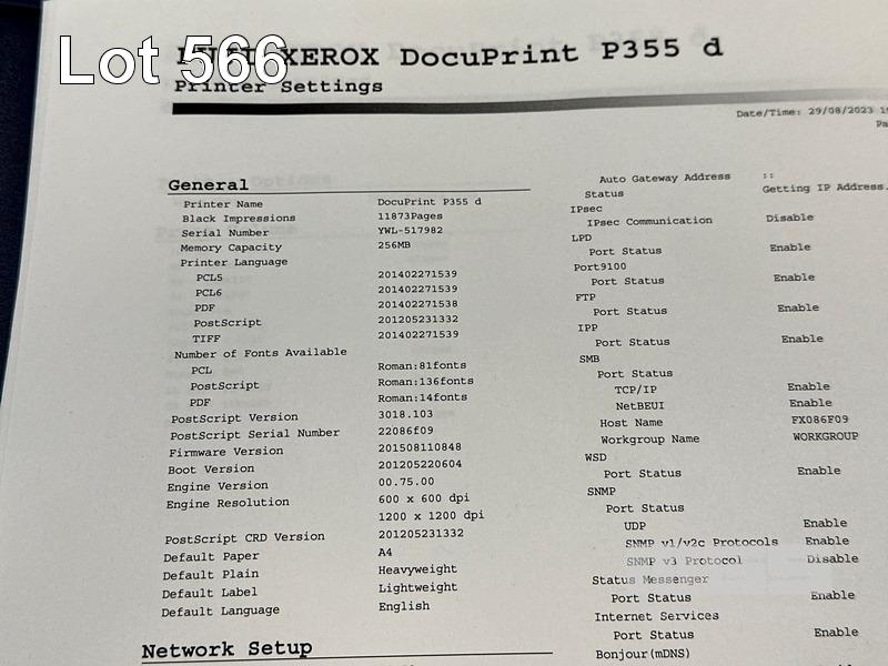 PRINTER, FUJI XEROX DOCUPRINT P355d LASER, USB, NETWORK, 11,872 PAGES (TEST PAGE ATTACHED) S/N:YWL517982
