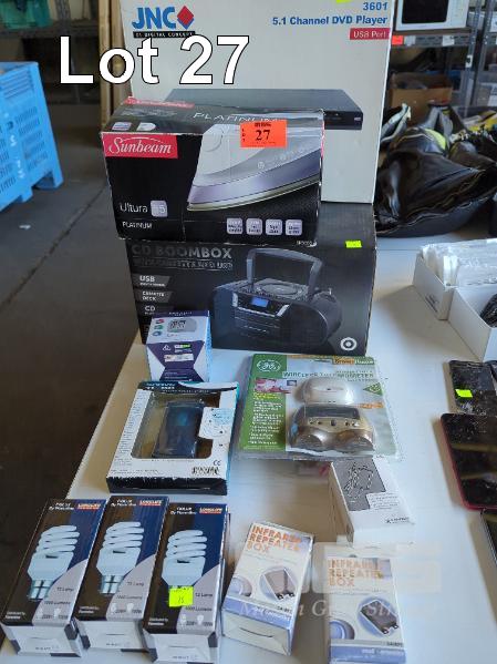CD BOOM BOX, DVD PLAYER, STEAM IRON & ASSORTED ELECTRICAL