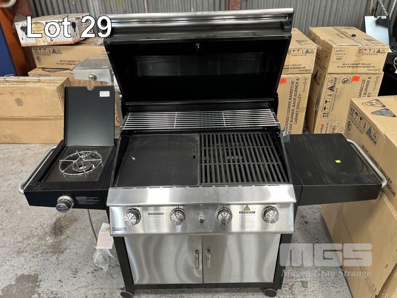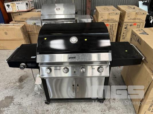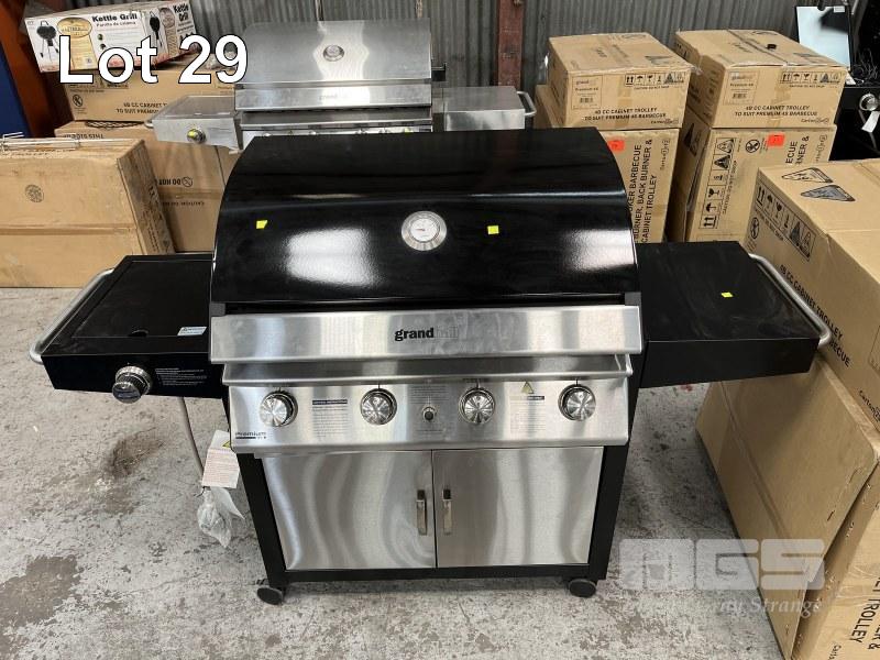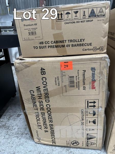 GRANDHALL PREMIUM 4 BURNER HOODED BBQ, BLACK SIDEBURNER & TROLLEY MODEL: 1001SPP NEW IN BOX (2 BOXES)