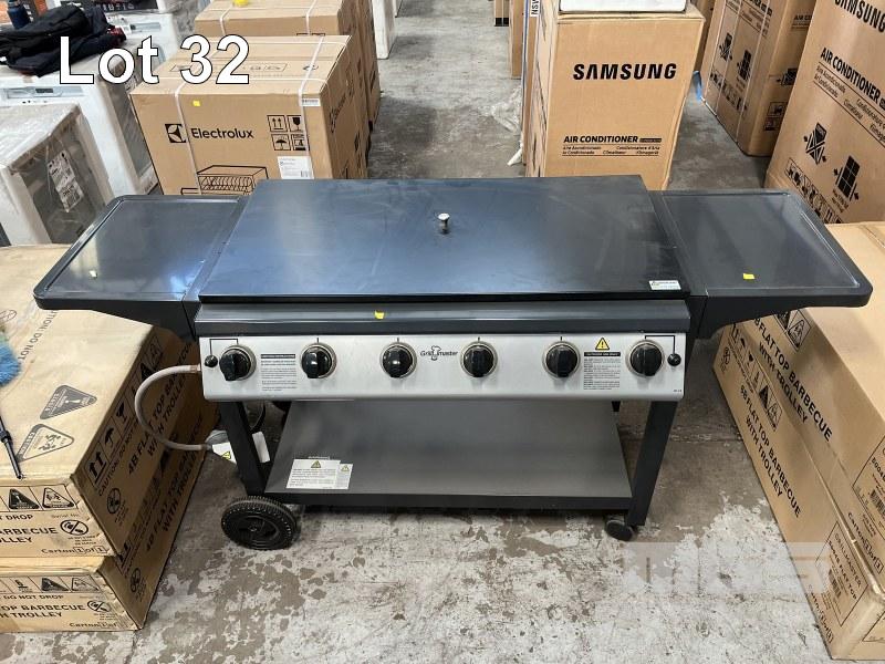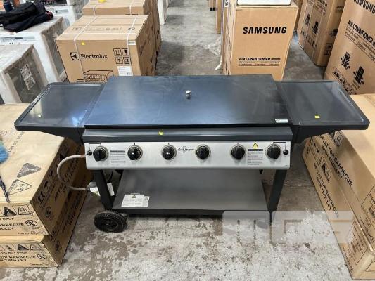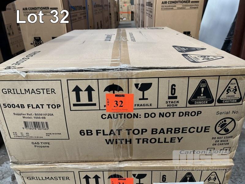 GRILLMASTER 6 BURNER FLAT TOP BBQ, ON MOBILE TROLLEY MODEL: 1000-6B NEW IN BOX (1 BOX) ORP: $799