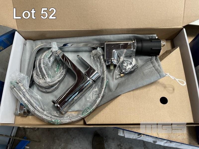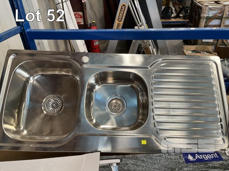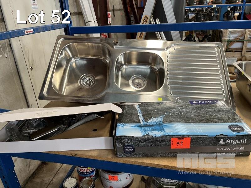 3 x ARGENT MIXER TAP SETS, 2 CHROME, 1 BLACK, (MISSING SOME FITTINGS) & TWIN BOWL STAINLESS STEEL SINK, 1080 x 485mm