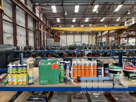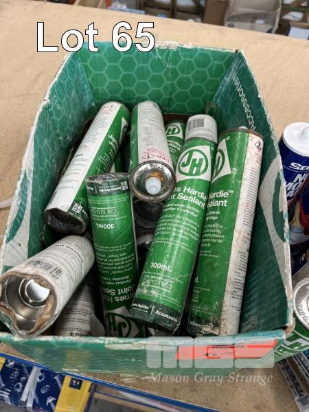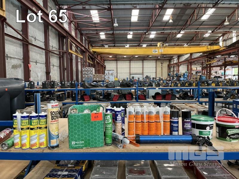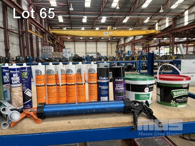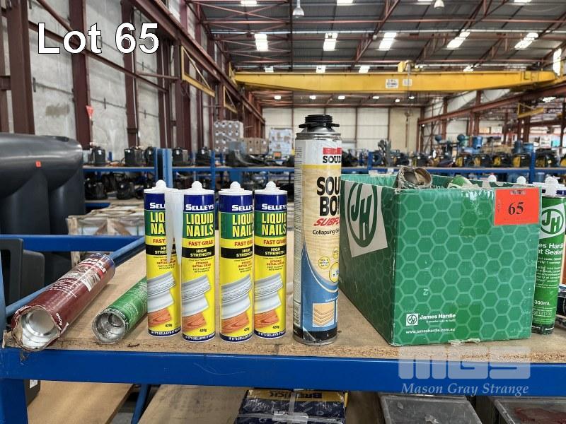 CONTENTS OF SHELF, 2 x CAULKING GUNS, LIQUID NAILS, JOINT SEALANT, VARIOUS SILICONES, ENAMELS, GYPROCK TOPPING COMPOUND, BONDCRETE, BUILDERS BOG, ANCHORING ADHESIVE ETC.