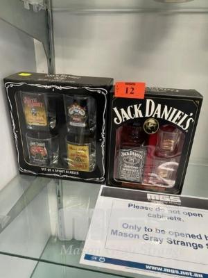 TWO JACK DANIEL'S "OLD No.7 BRAND" GIFT PACKS. 1 @ PACK CONTAINING SET OF 4 JACK DANIEL'S SPIRIT GLASSES. 1 @ PACK CONTAINING 1 X BOTTLE JACK DANIEL'S OLD TIME "OLD No. 7 BRAND" SOUR MASH WHISKY, 350ML AND 2 X JACK DANIEL'S QUALITY TENNESSEE WHISKY SPIRIT GLASSES.