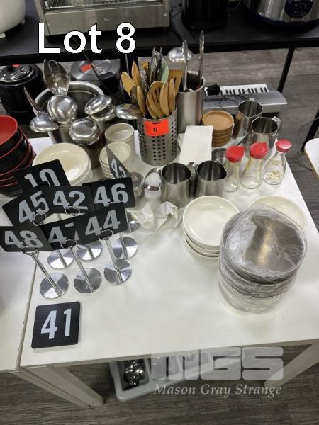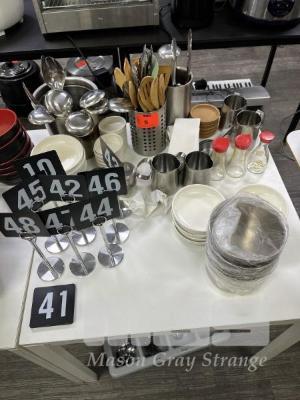 STAINLESS STEEL SERVING SPOONS, TONGS, WOODEN SPATULAS & SPOONS, SALT & PEPPER SHAKERS, STAINLESS STEEL MILK JUGS, SERVING PLATES, TABLE NUMBER STANDS ETC.