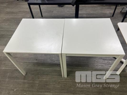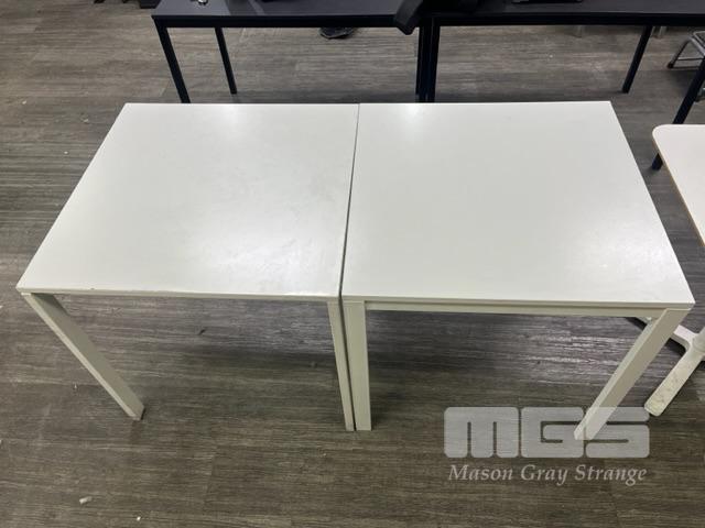 2 x CAFE TABLES, WHITE TIMBER LAMINATE, WHITE STEEL FRAME, 750 x 750mm