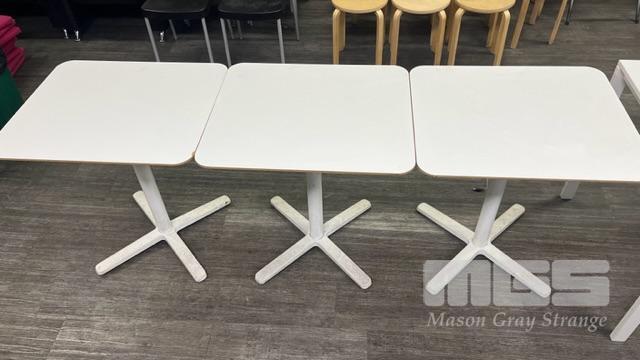 3 x CAFE TABLES, WHITE MDF LAMINATE TOPS, WHITE STEEL FRAMES, 600 x 700mm