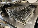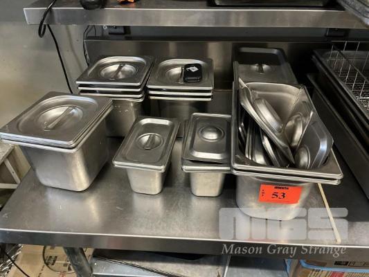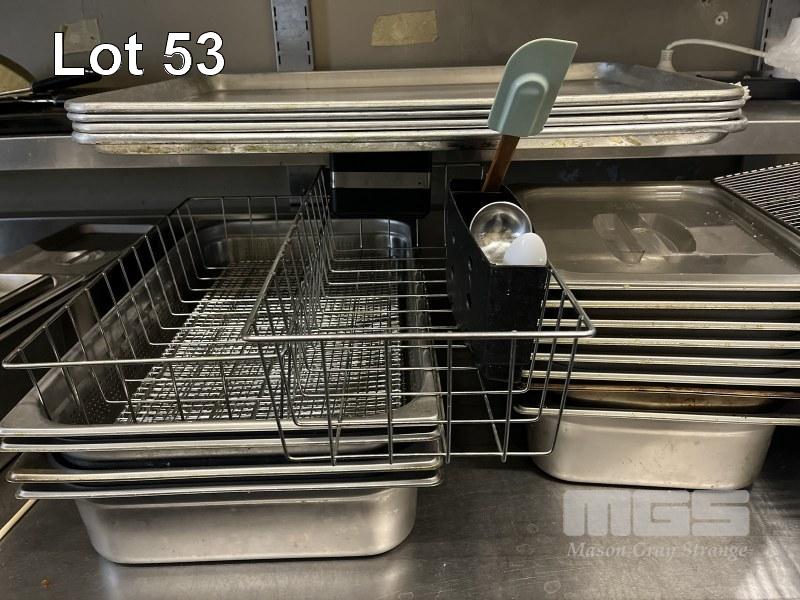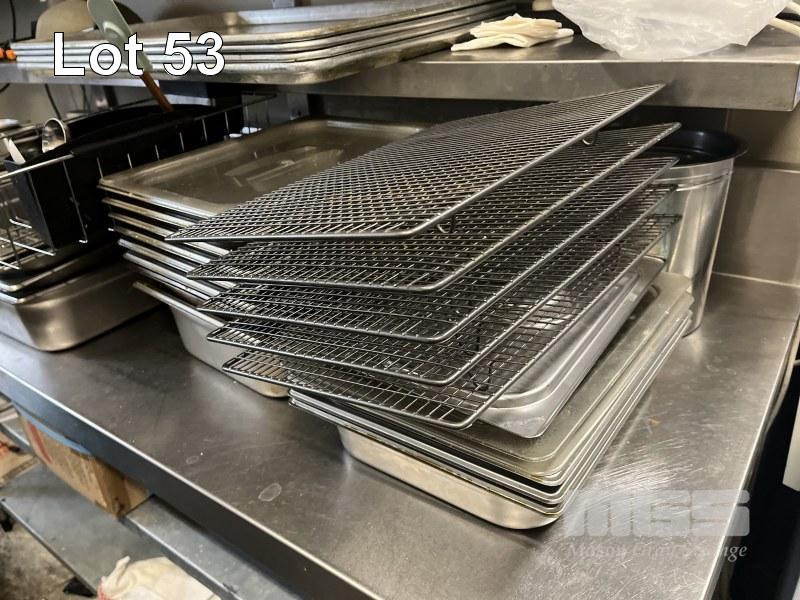 32 x ASSORTED STAINLESS STEEL GASTRONORM TRAYS, SOME WITH LIDS, PLUS ASSORTED STAINLESS STEEL DRYING RACKS