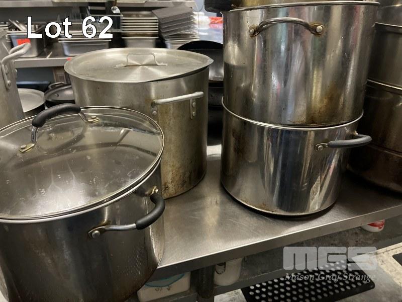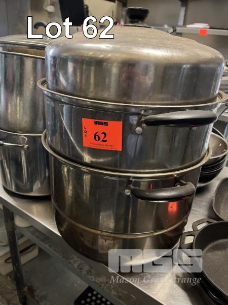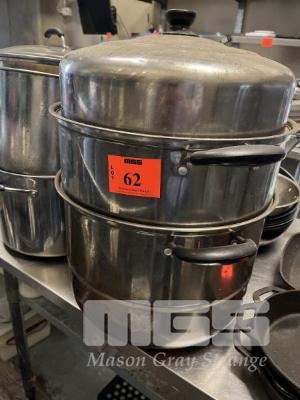 5 x ASSORTED STAINLESS STEEL POTS, 1 x 3 TIER STAINLESS STEEL STEAMER POT