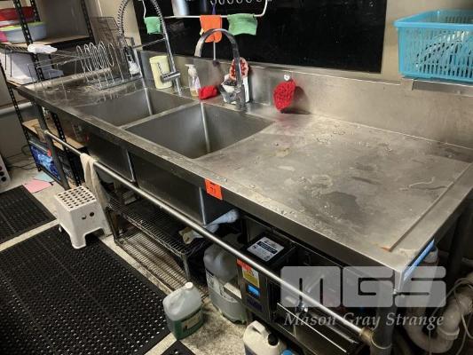 LARGE TWIN BOWL STAINLESS STEEL SINK WITH SPLASH BACK, FLEXI HOSE TAP & MIXER TAP, 2600 x 660 x 1130mm (H)