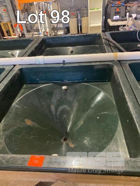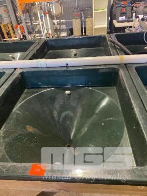 2 x FIBREGLASS TANKS, GREEN, CONE BASE WITH OUTLET TO BASE 1100 x 1100mm WITH PLASTIC GRID
