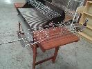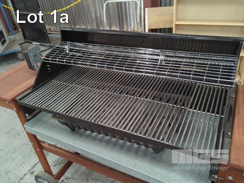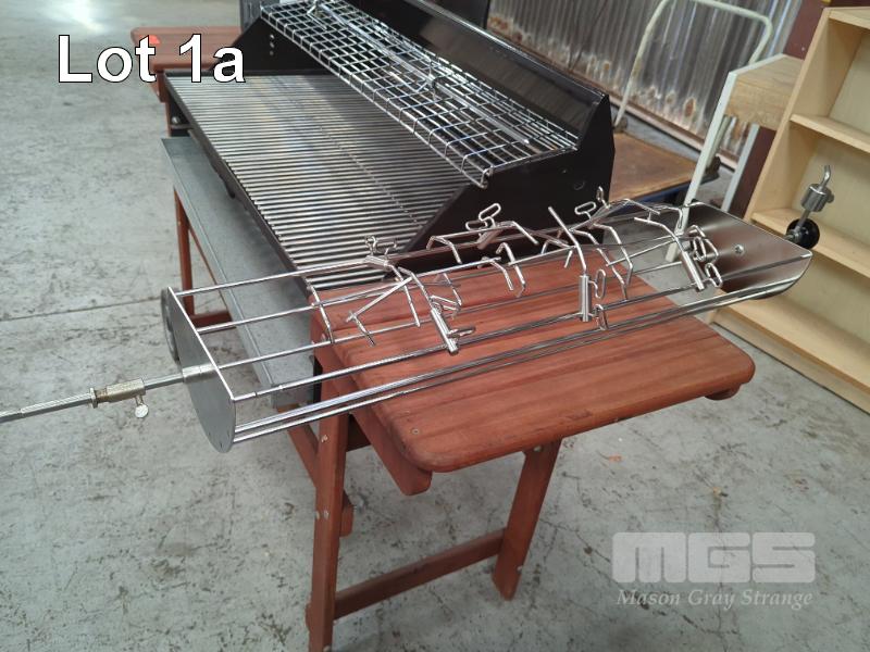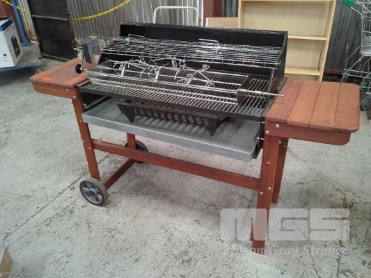 MOBILE CHARCOAL GRILL BBQ, JARRAH TROLLEY, STAINLESS STEEL GRILL, MEAT RESTING SHELF, 240V ROTISSERIE MOTOR, 1095 MM SPIT ROD WITH SKEWER FORKS AND PREMIUM STAINLESS STEEL 28" X 8" ROTISSERIE CRADLE.