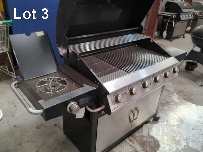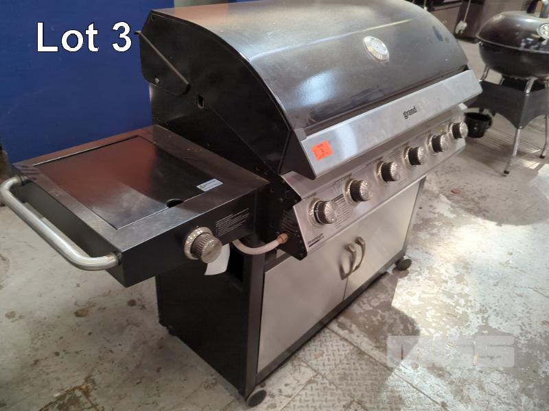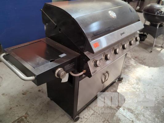 GRANDHALL PREMIUM 6V MOBILE GLOSS BLACK COVERED GAS BBQ ON CABINET TROLLEY ** EX DISPLAY MODEL - ASSEMBLED ** FEATURES MATCHING HOOD & 2-DOOR MATCHING CABINET, 6-BURNERS PLUS SIDEBURNER. ** ELECTRONIC IGNITION PRESENT BUT NOT IN PLACE ** MODEL 1001SPP ORP $799