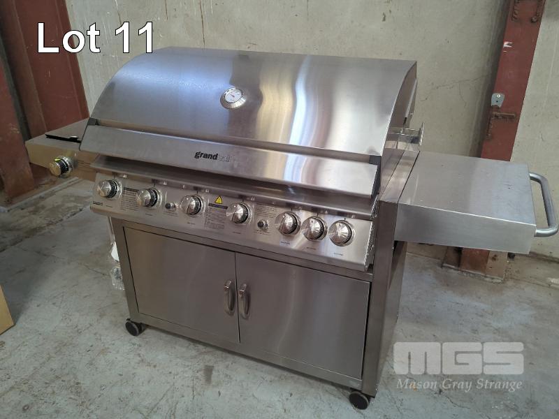 GRANDHALL PREMIUM 6S MOBILE STAINLESS STEEL COVERED GAS BBQ ON CABINET TROLLEY. FEATURES STAINLESS STEEL HOOD, 2-DOOR STAINLESS STEEL CABINET TROLLEY WITH 6-BURNERS PLUS BACK-BURNER, SIDEBURNER AND ELECTRONIC IGNITION. MODEL1004SS.C NEW IN BOX (2 X BOXES). ORP $1,799