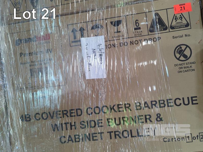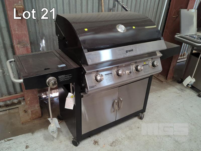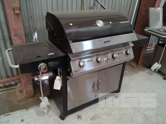 GRANDHALL PREMIUM 4V MOBILE GLOSS BLACK COVERED GAS BBQ ON CABINET TROLLEY. FEATURES MATCHING HOOD & 2-DOOR MATCHING CABINET, 4-BURNERS PLUS SIDEBURNER AND ELECTRONIC IGNITION. MODEL 1001SPP NEW IN BOX (2 x BOXES). ORP $799