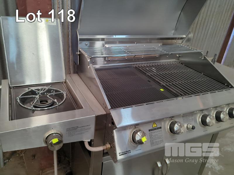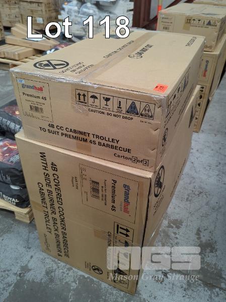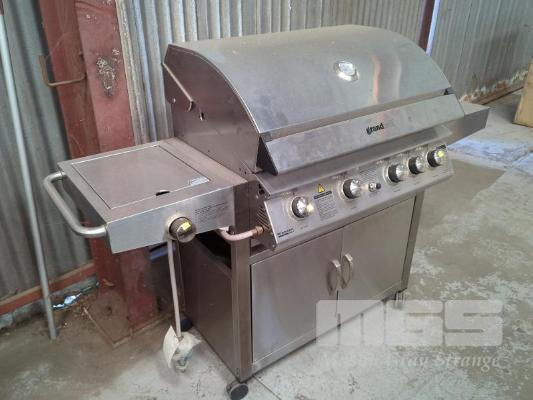 GRANDHALL PREMIUM 4S MOBILE STAINLESS STEEL COVERED GAS BBQ ON CABINET TROLLEY. FEATURES STAINLESS STEEL HOOD, 2-DOOR STAINLESS STEEL CABINET TROLLEY WITH 4-BURNERS PLUS BACK-BURNER, SIDEBURNER AND ELECTRONIC IGNITION. MODEL 1001SPP NEW IN BOX (2 X BOXES). ORP $1,599 NO GST