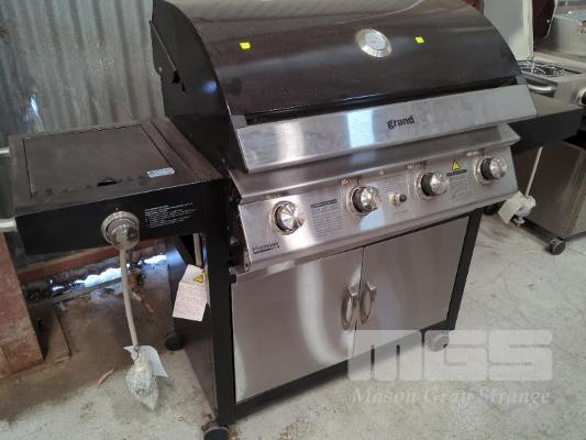 GRANDHALL PREMIUM 4V MOBILE GLOSS BLACK COVERED GAS BBQ ON CABINET TROLLEY.
