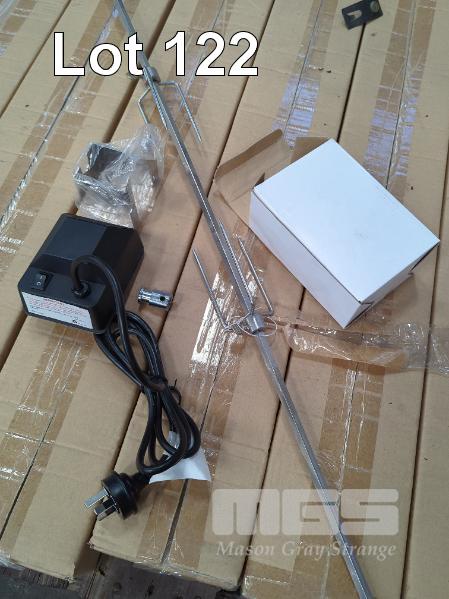 ELECTRIC STAINLESS STEEL ROTISSERIE KIT * SUIT 4-BURNER BBQ * 240V A.C. MOTOR, 935 MM SPIT ROD, 2 X SKEWER FORKS, COLLAR, MOUNTING BRACKETS ETC. ORP $139