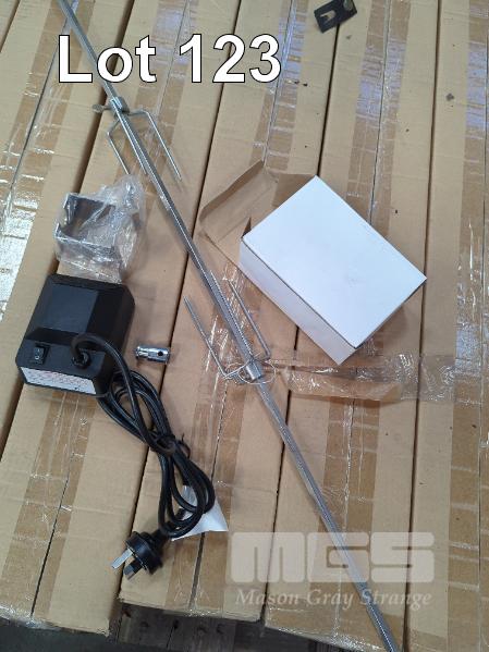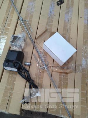 ELECTRIC STAINLESS STEEL ROTISSERIE KIT * SUIT 4-BURNER BBQ * 240V A.C. MOTOR, 935 MM SPIT ROD, 2 X SKEWER FORKS, COLLAR, MOUNTING BRACKETS ETC. ORP $139