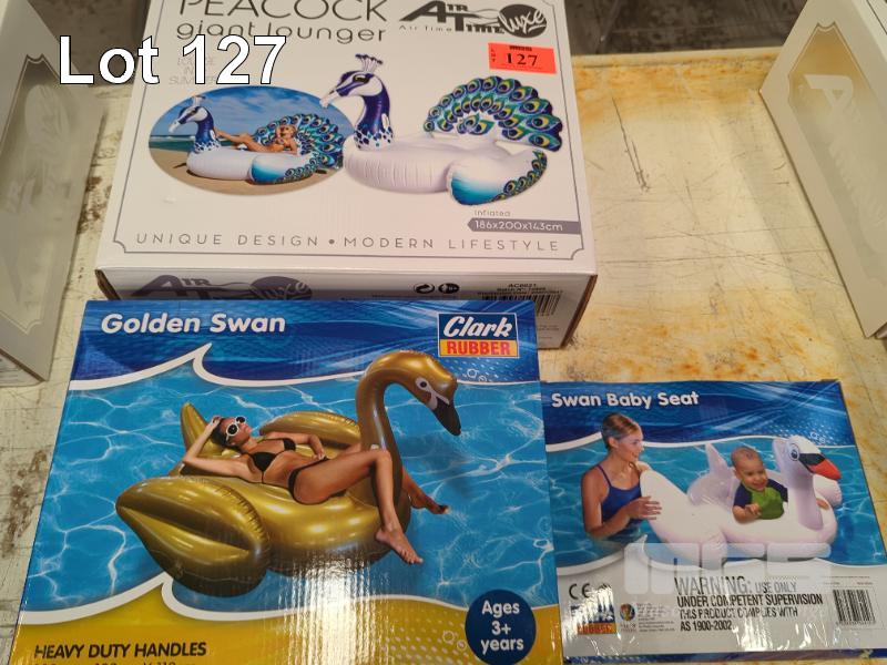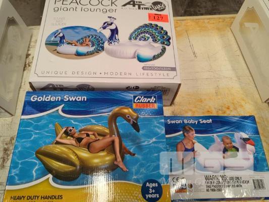 3 X INFLATABLE RIDE-ON WATER PLAY TOYS. GIANT LOUNGER, GOLDEN SWAN AND BABY SEAT (ALL NEW).