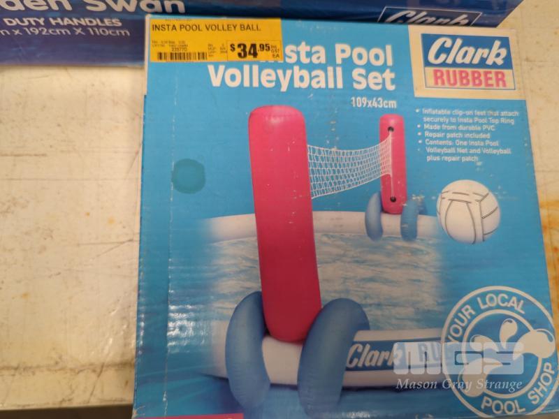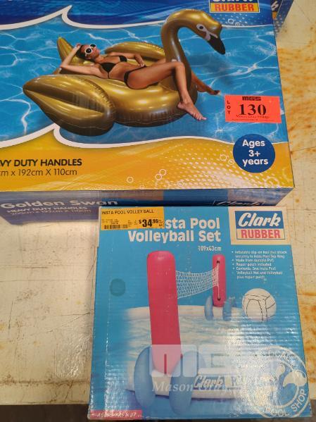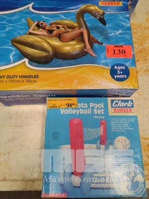 GOLDEN SWAN INFLATABLE RIDE-ON WATER PLAY TOY AND INFLATABLE POOL VOLLEYBALL SET (ALL NEW).