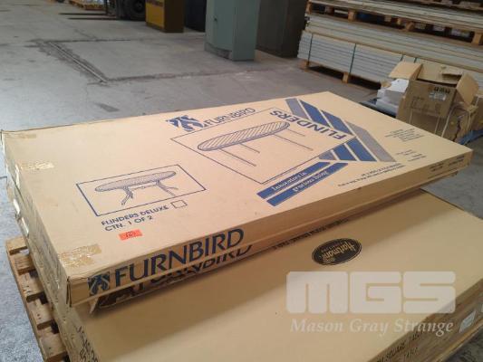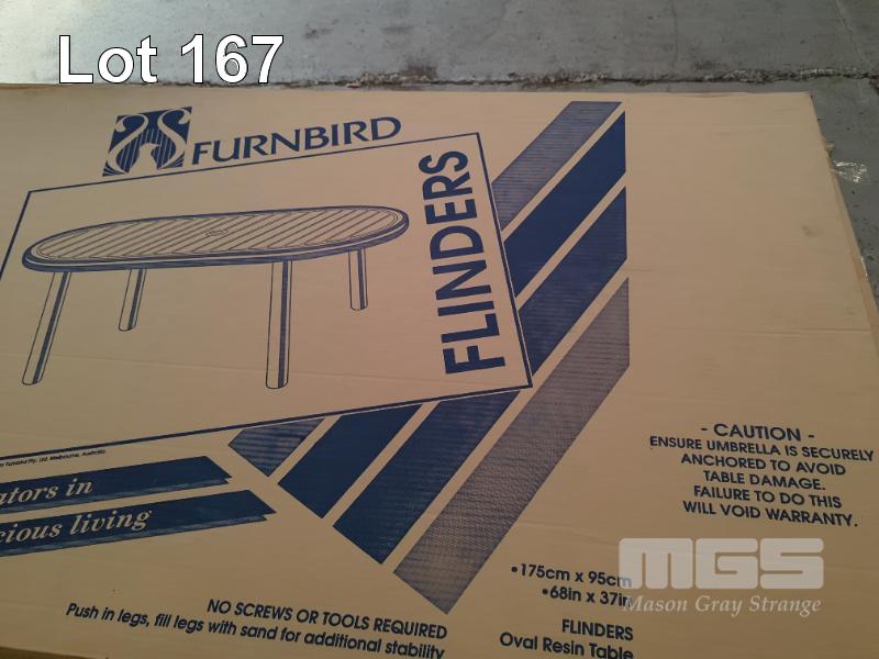 FURNBIRD "FLINDERS" OVAL RESIN OUTDOOR TABLE, 175 X 95 CM. COLOUR WHITE WITH UMBRELLA HOLE. NEW IN BOX.