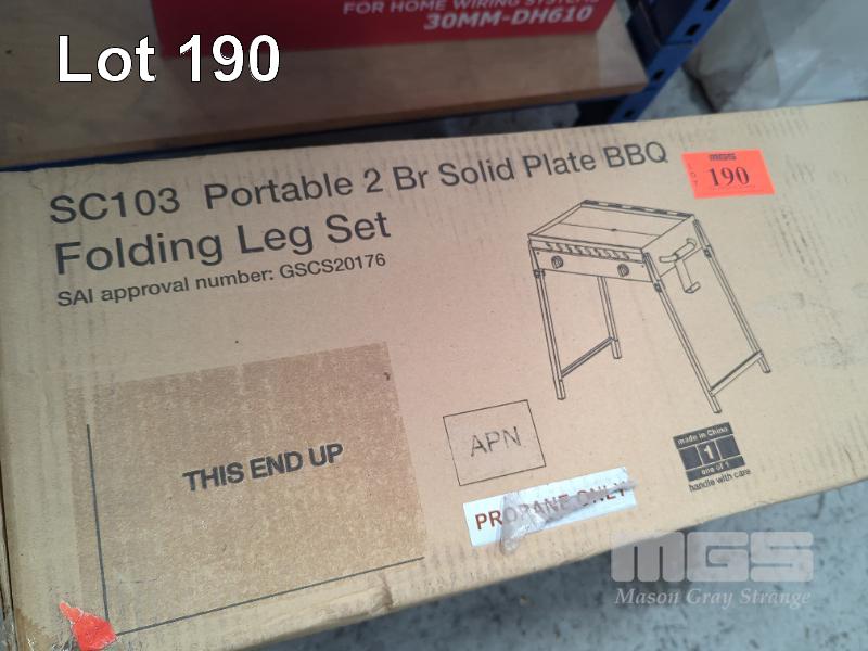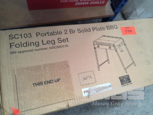 PORTABLE 2-BURNER SOLID PLATE GAS BBQ WITH FOLDING LEGS.
