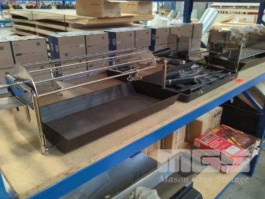 ASSORTED BBQ (1 X SHELF). INCLUDES ROTISSERIE CRADLE & 2 X CHARCOAL GRILLS PLUS COMPONENTS AND UTENSILS KIT.