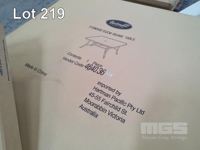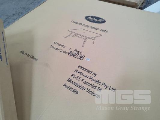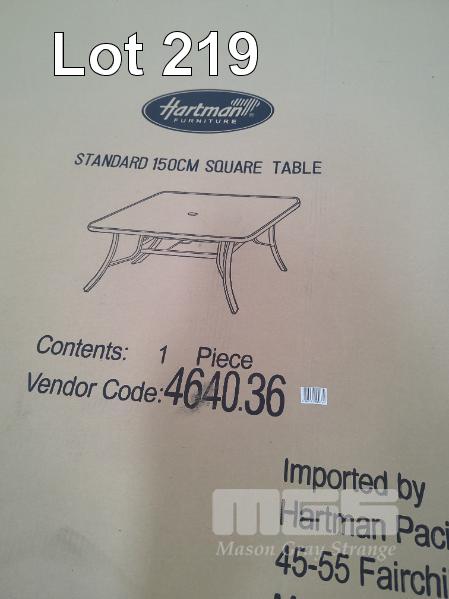HARTMAN STANDARD SQUARE TABLE OUTDOOR TABLE, 1.5 X 1.5 M. WITH UMBRELLA HOLE. NEW IN BOX.
