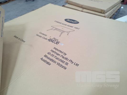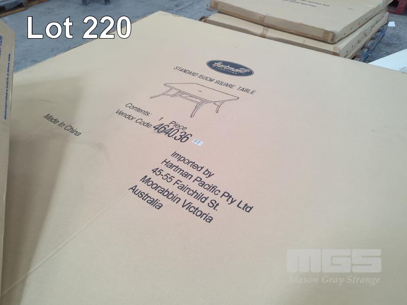 HARTMAN STANDARD SQUARE TABLE OUTDOOR TABLE, 1.5 X 1.5 M. WITH UMBRELLA HOLE. NEW IN BOX.