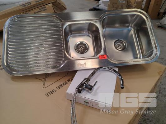SINK & MIXER COMBO. DOUBLE BASIN STAINLESS STEEL SINK AND CHROME SINGLE LEVER SINK MIXER TAP, CURVED SPOUT. ALL NEW.