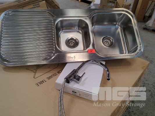 SINK & MIXER COMBO. DOUBLE BASIN STAINLESS STEEL SINK AND CHROME SINGLE LEVER SINK MIXER TAP, CURVED SPOUT. ALL NEW.