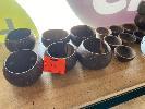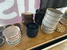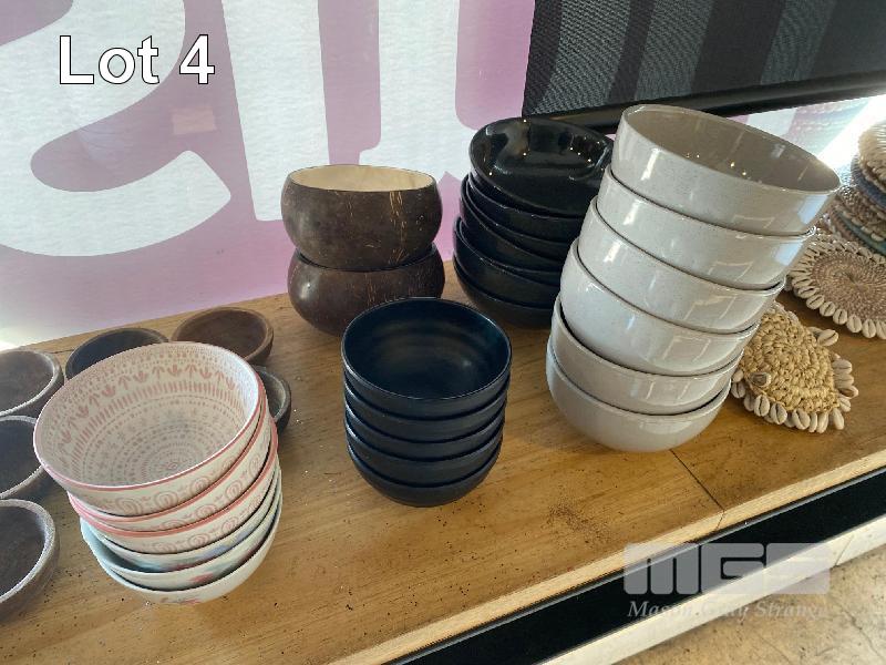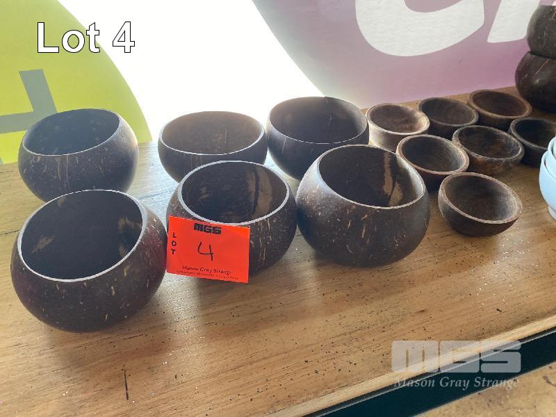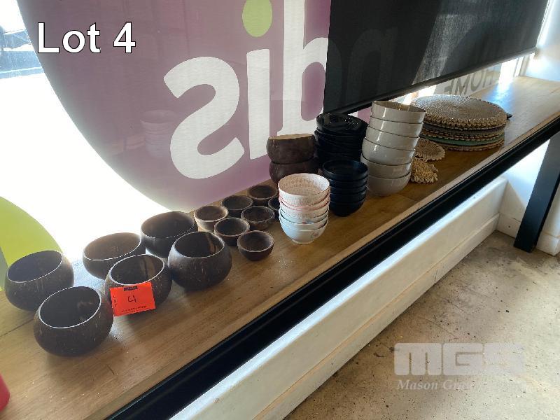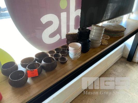 QUANTITY ASSORTED SMALL BOWLS, COCONUT & PORCELAINE, PLUS WOVEN SEA SHELL COASTERS, WOODEN SPOONS