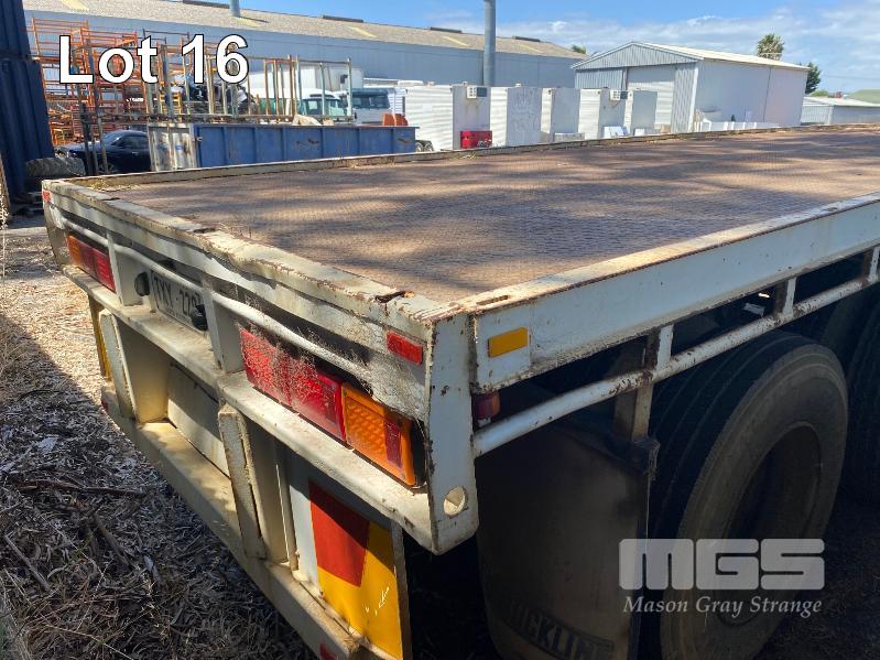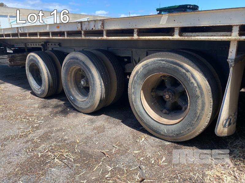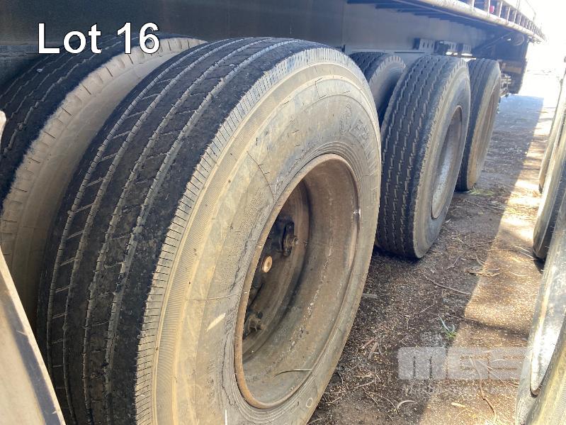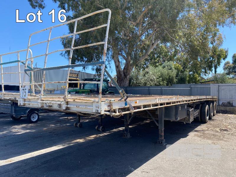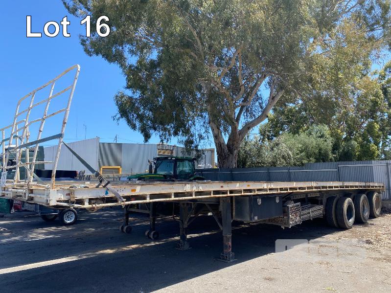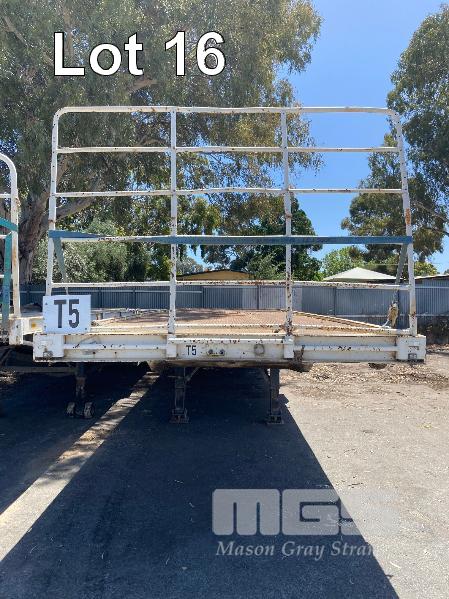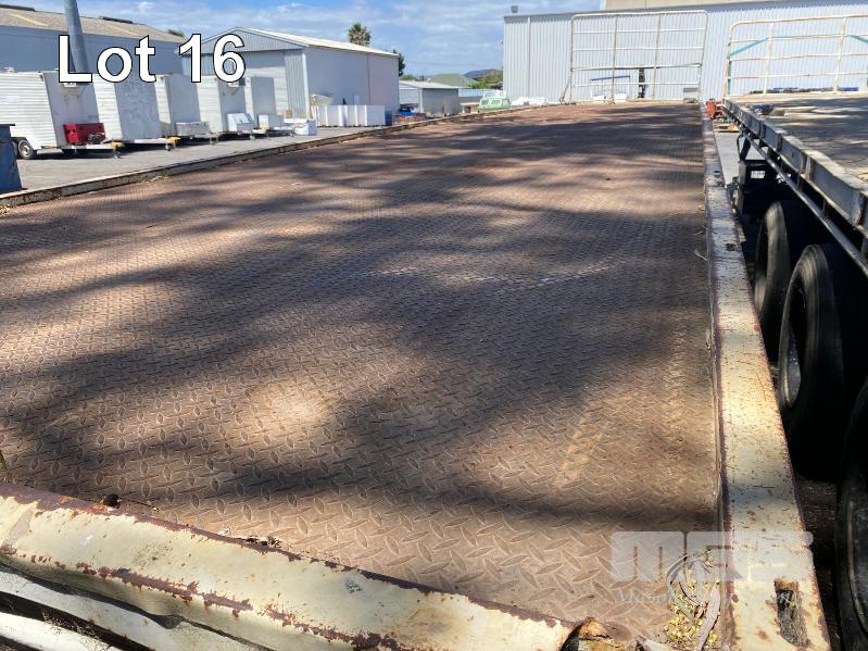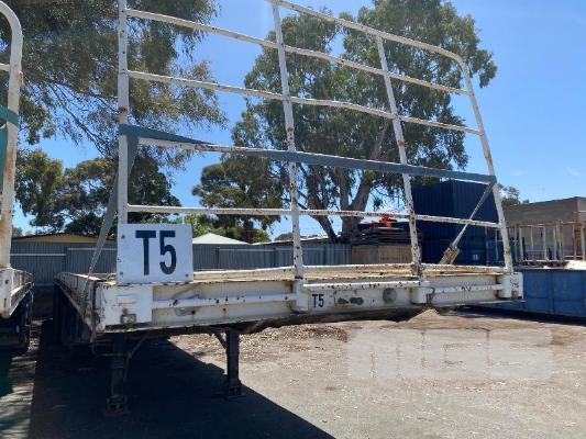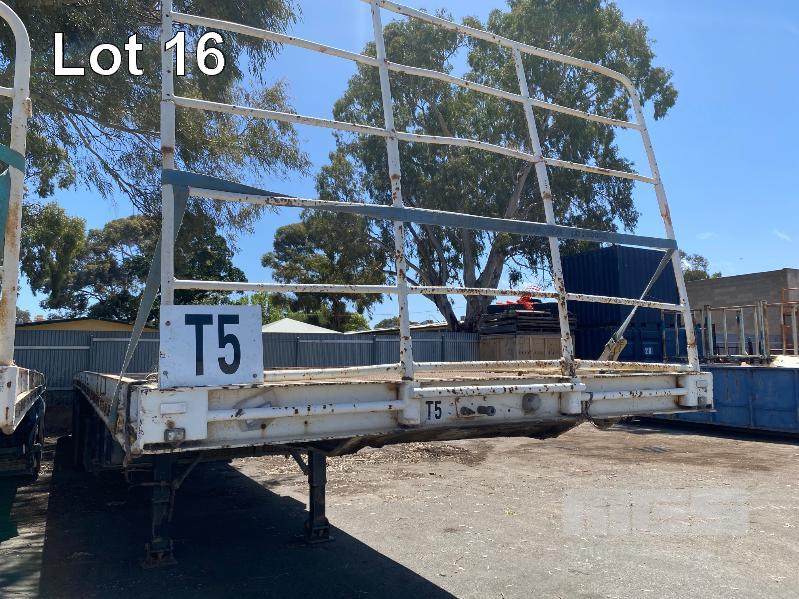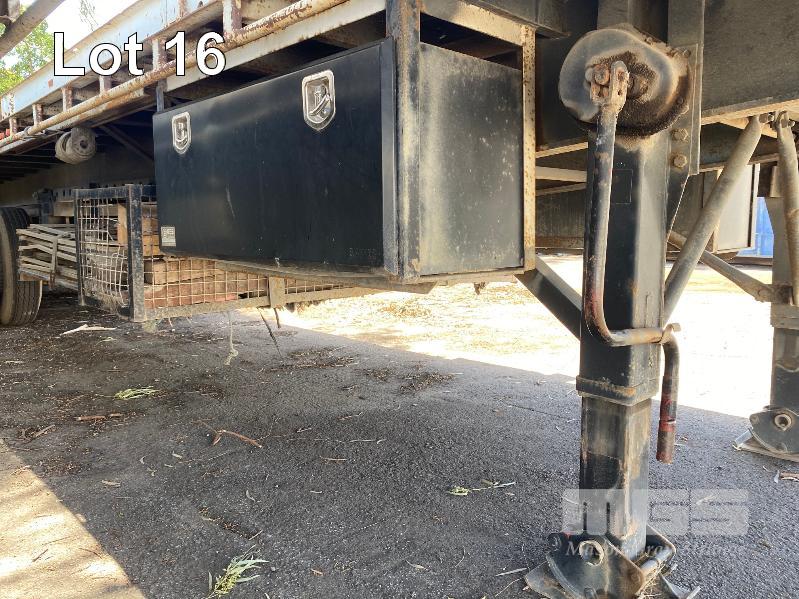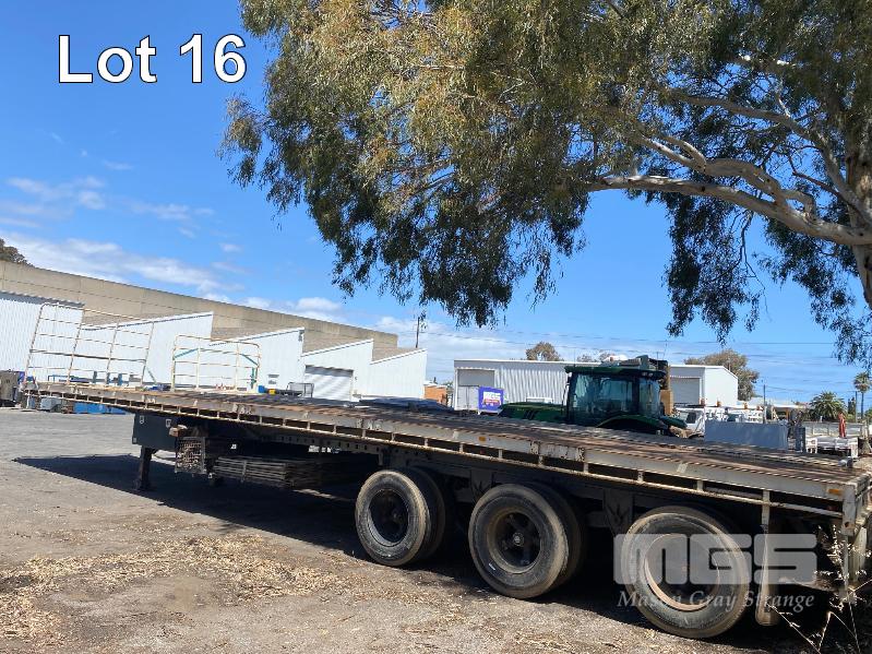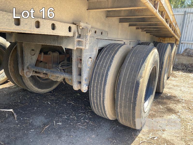45' (13.7m) TRI AXLE SEMI TRAILER FLAT TOP REG: TXY 220 (SA) PLANT NO: T5 HUBOMETER: STEMCO 1,108kms SHOWING SPRING SUSPENSION, 11R22.5, DRUM BRAKES, CHECKER PLATE STEEL DECK SET GATES 2 x UNDER TRAY TOOL BOXES UNDER TRAY BEARING CAGE TYRES: AVERAGE CONDITION 1 x GATE (WITH PAPERS)