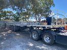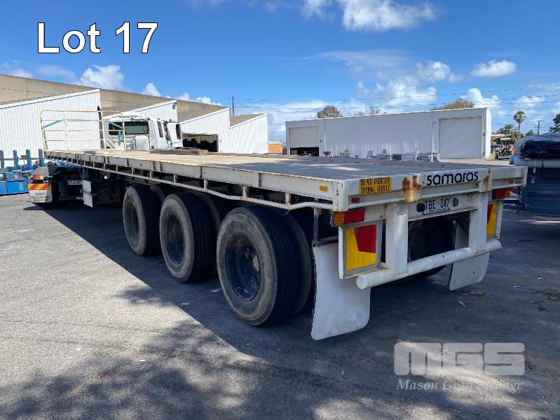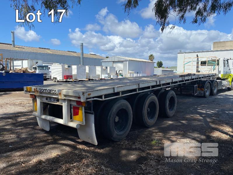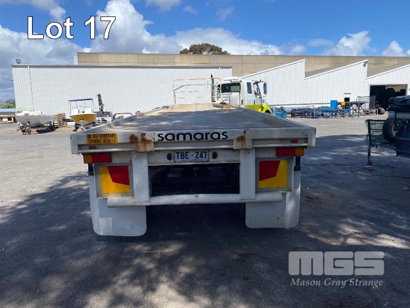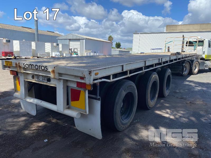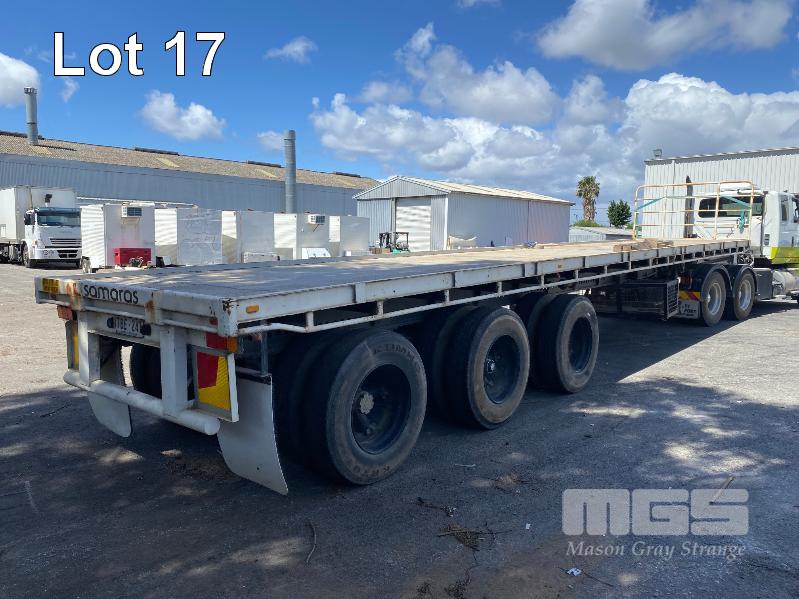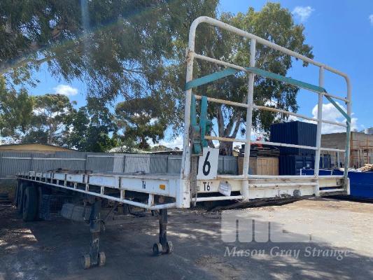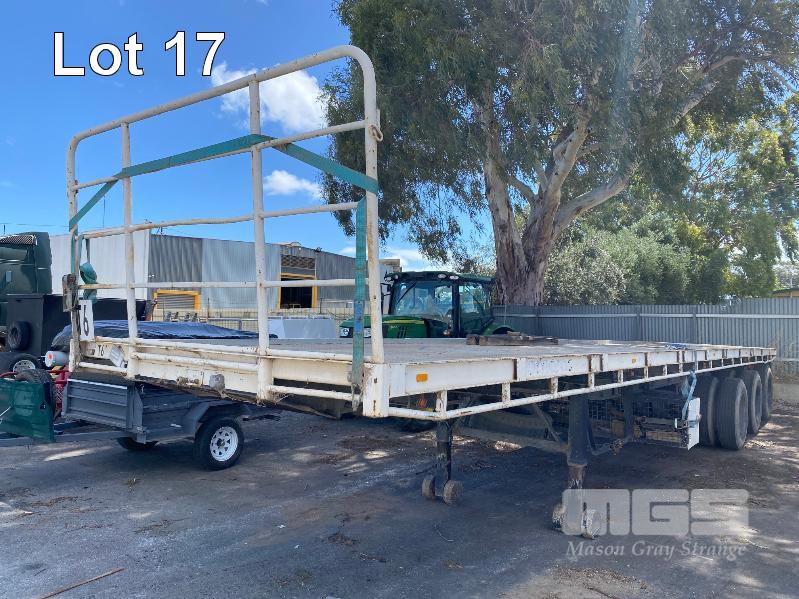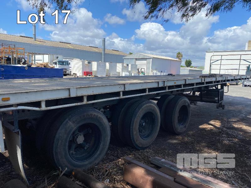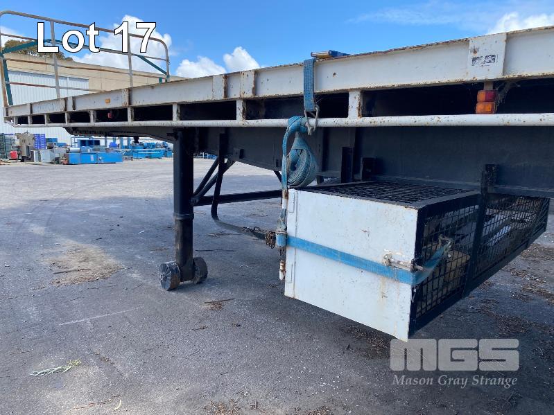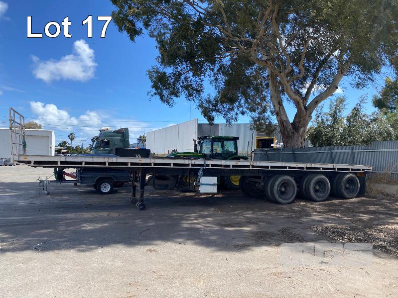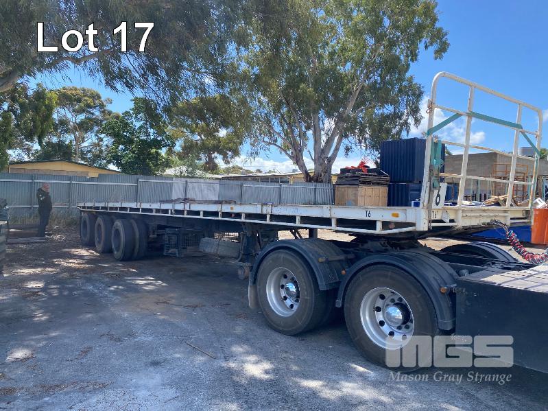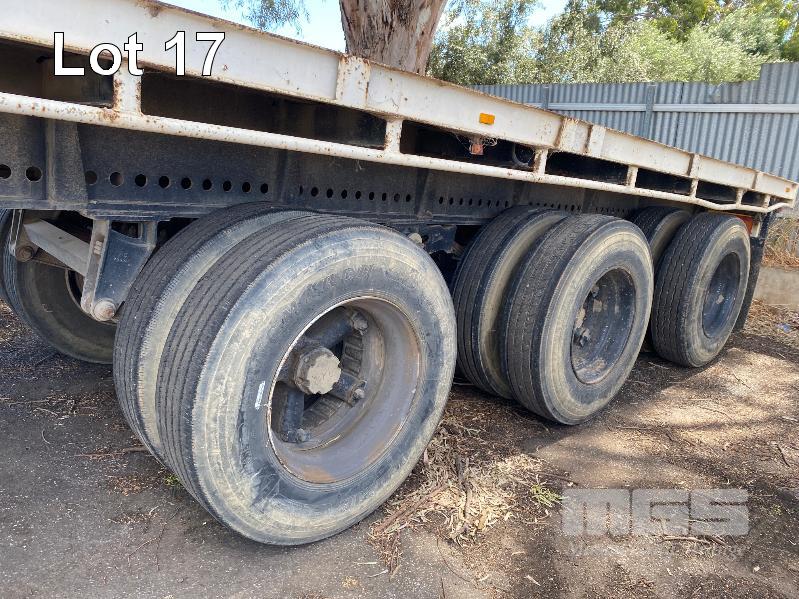 41' (12.5m) TRI AXLE SEMI TRAILER FLAT TOP REG: TBE 247 (SA) PLANT NO: T6 HUBOMETER: STEMCO 1,228kms SHOWING SPRING SUSPENSION, SPIDER RIMS, 11R 22.5, DRUM BRAKES, CHECKER PLATE STEEL DECK 1 x FRONT GATE 1 x SPARE WHEEL UNDER TRAY BEARING CAGE TYRES: AVERAGE CONDITION (WITH PAPERS)