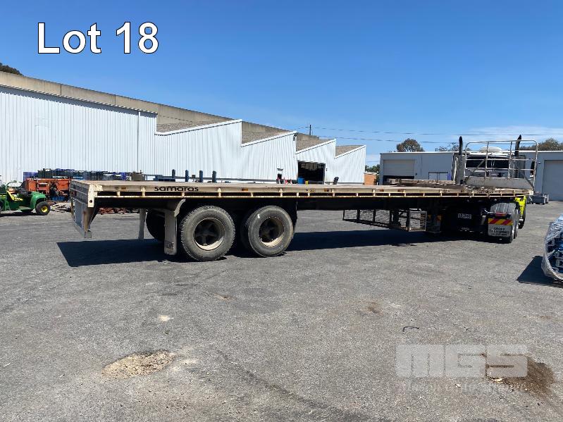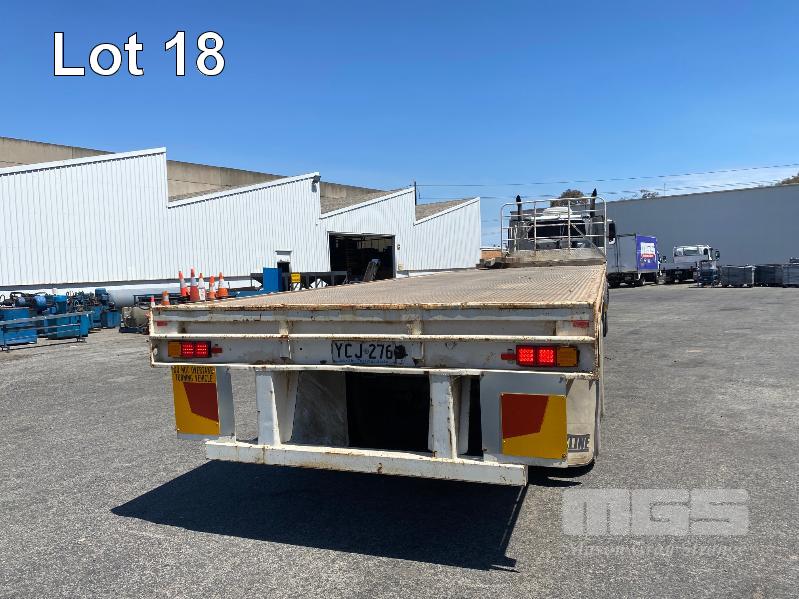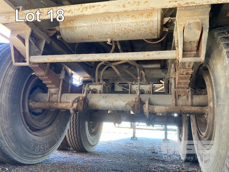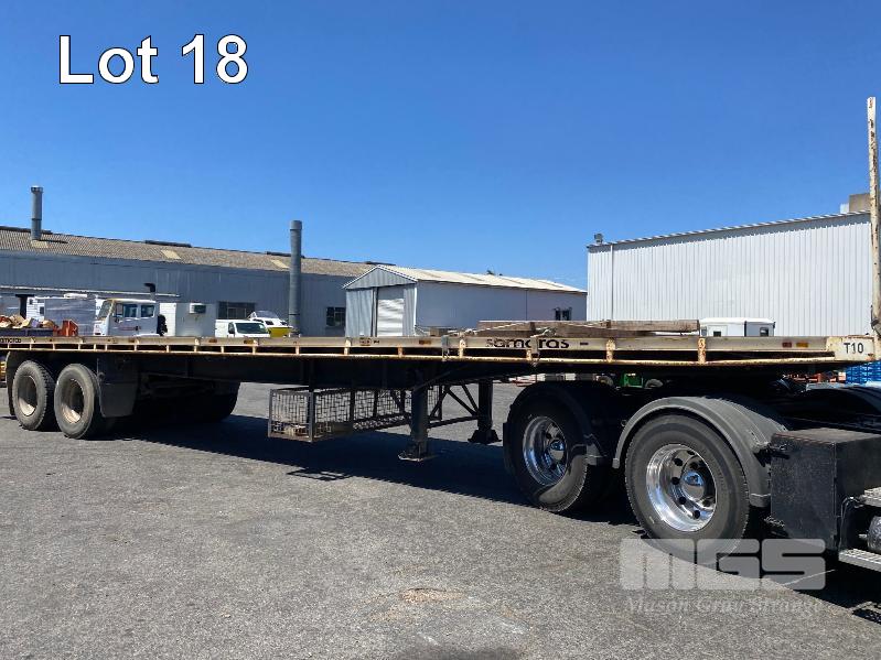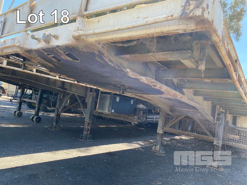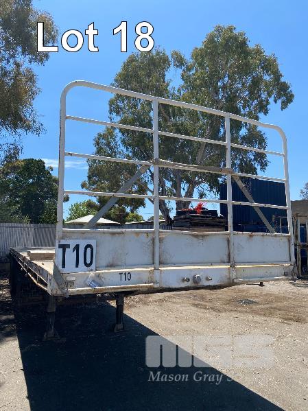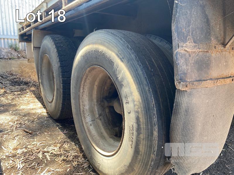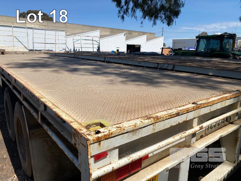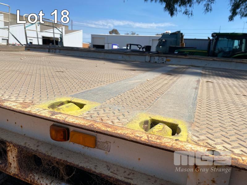 41' (12.5m) TANDEM AXLE SEMI TRAILER FLAT TOP REG: YCJ 276 (SA) PLANT NO: T10 HUBOMETER: DATA TRAC 343kms SHOWING SPRING SUSPENSION, SPIDER RIMS, 295/80R 22.5, DRUM BRAKES, TOOLBOX, CHECKER PLATE STEEL DECK 1 x FRONT GATE UNDER TRAY BEARING CAGE TYRES: AVERAGE CONDITION 8 x CONTAINER LOCKING PINS (WITH PAPERS)