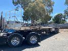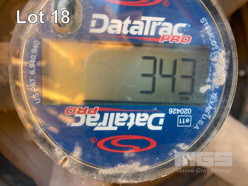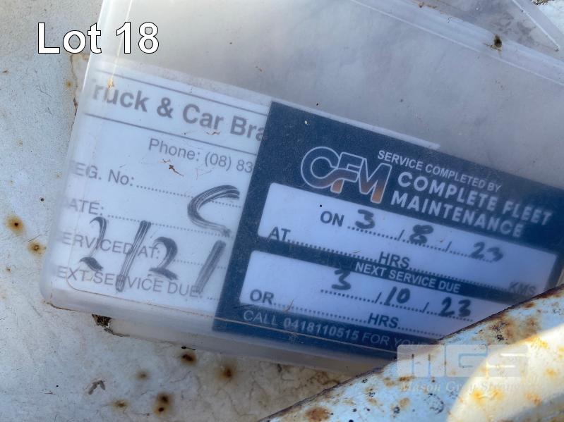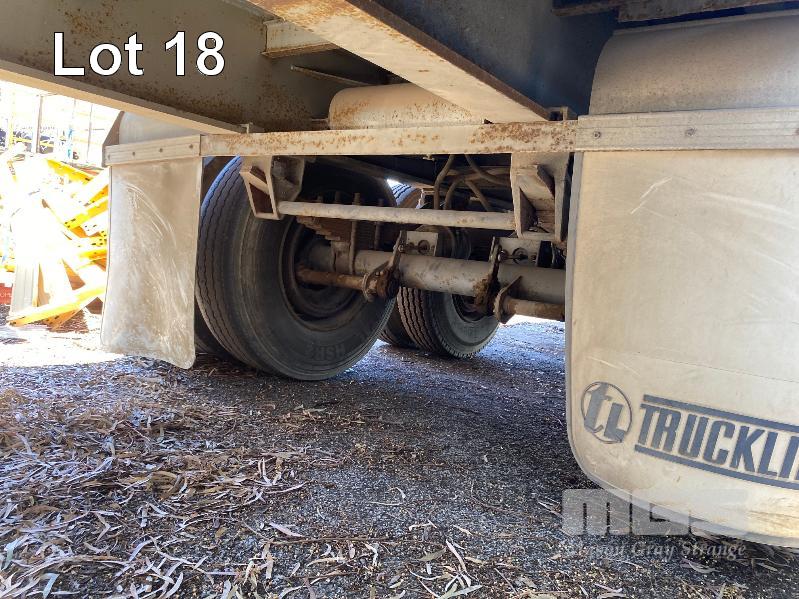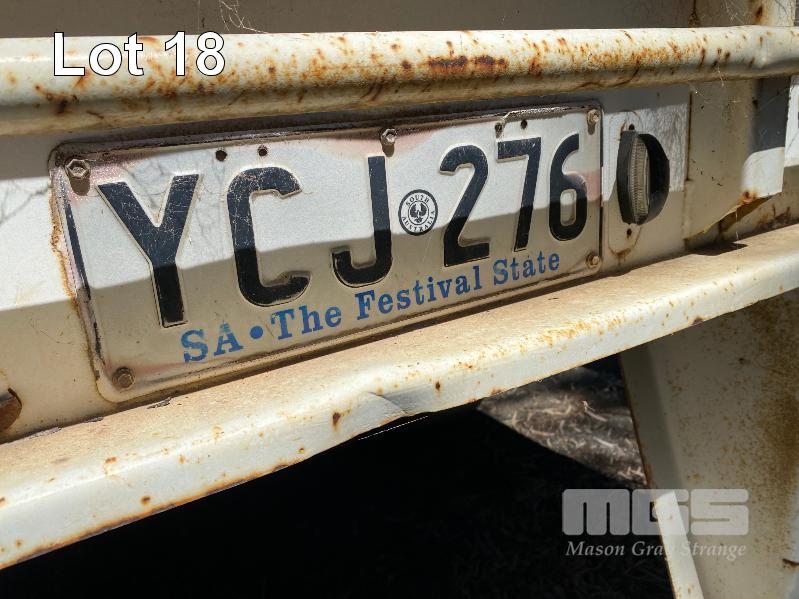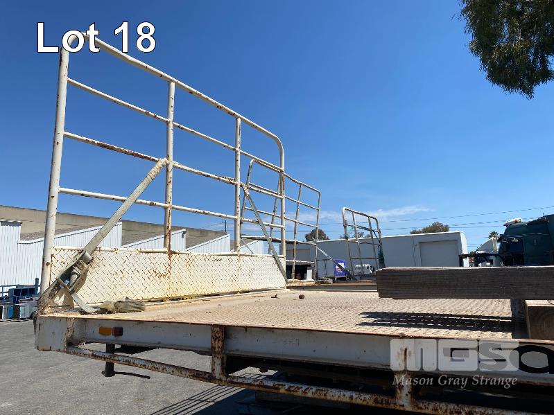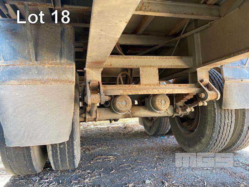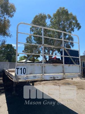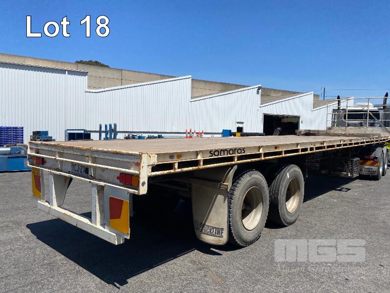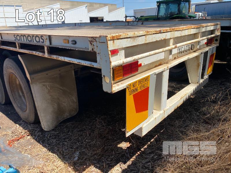 41' (12.5m) TANDEM AXLE SEMI TRAILER FLAT TOP REG: YCJ 276 (SA) PLANT NO: T10 HUBOMETER: DATA TRAC 343kms SHOWING SPRING SUSPENSION, SPIDER RIMS, 295/80R 22.5, DRUM BRAKES, TOOLBOX, CHECKER PLATE STEEL DECK 1 x FRONT GATE UNDER TRAY BEARING CAGE TYRES: AVERAGE CONDITION 8 x CONTAINER LOCKING PINS (WITH PAPERS)