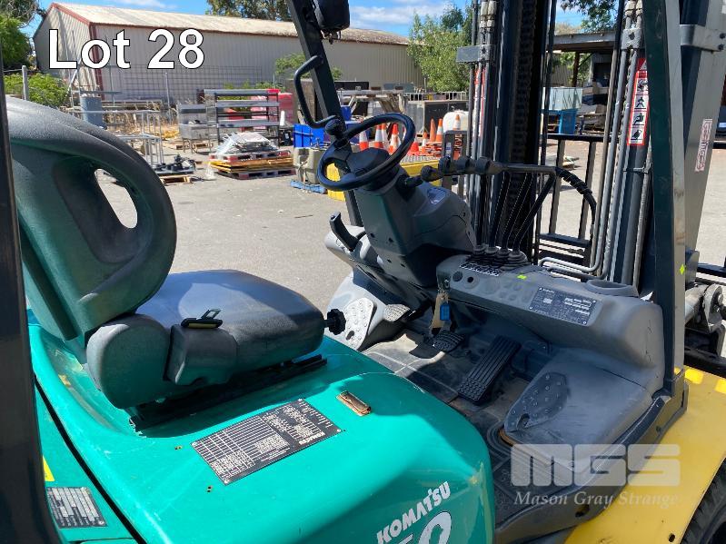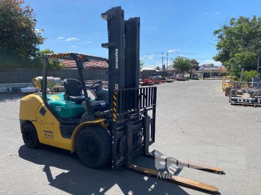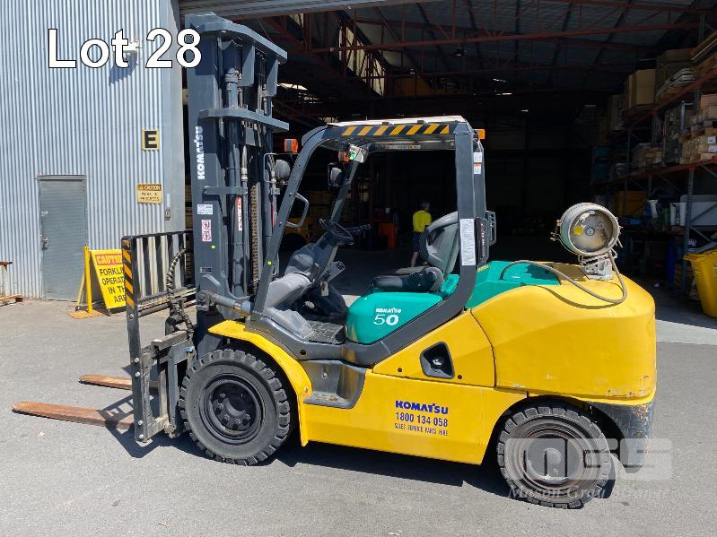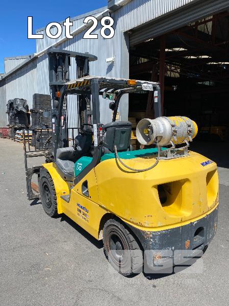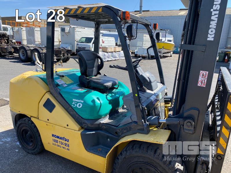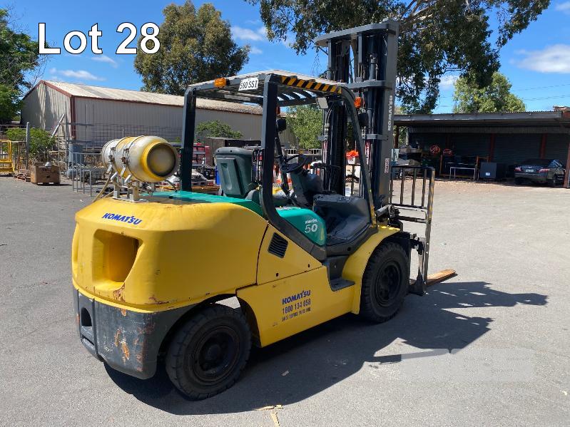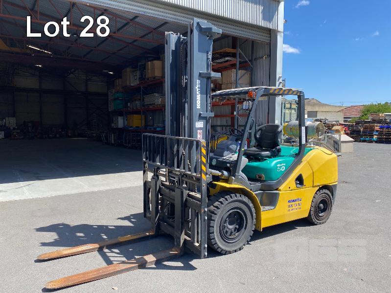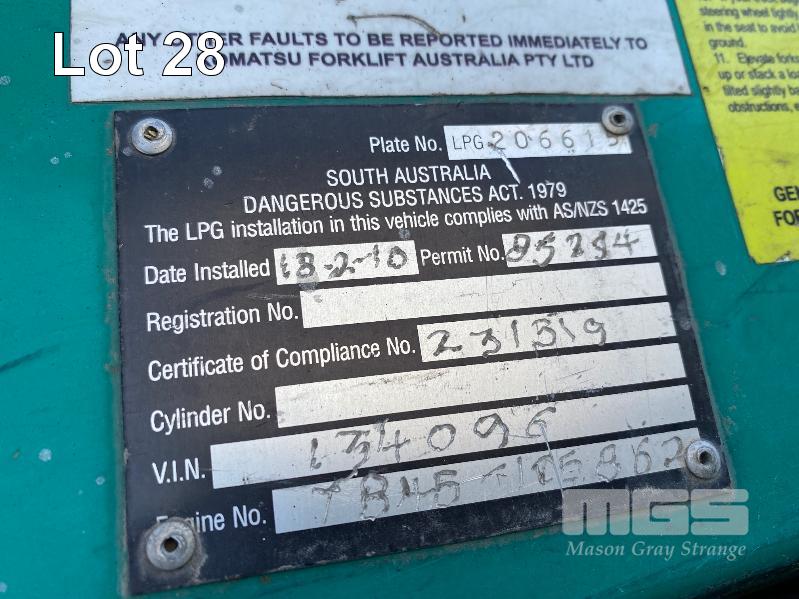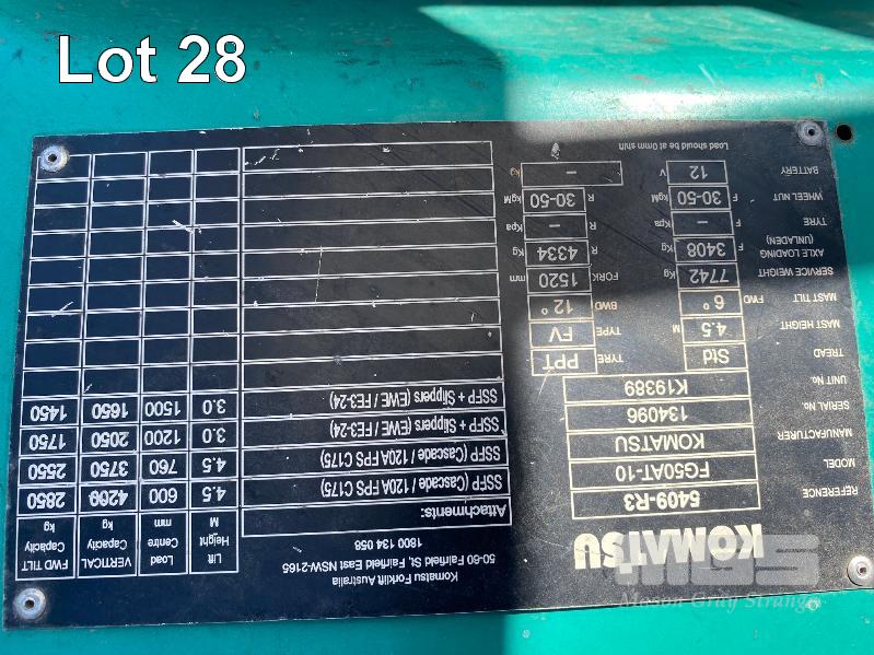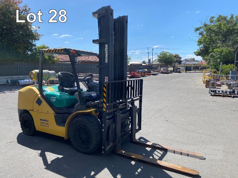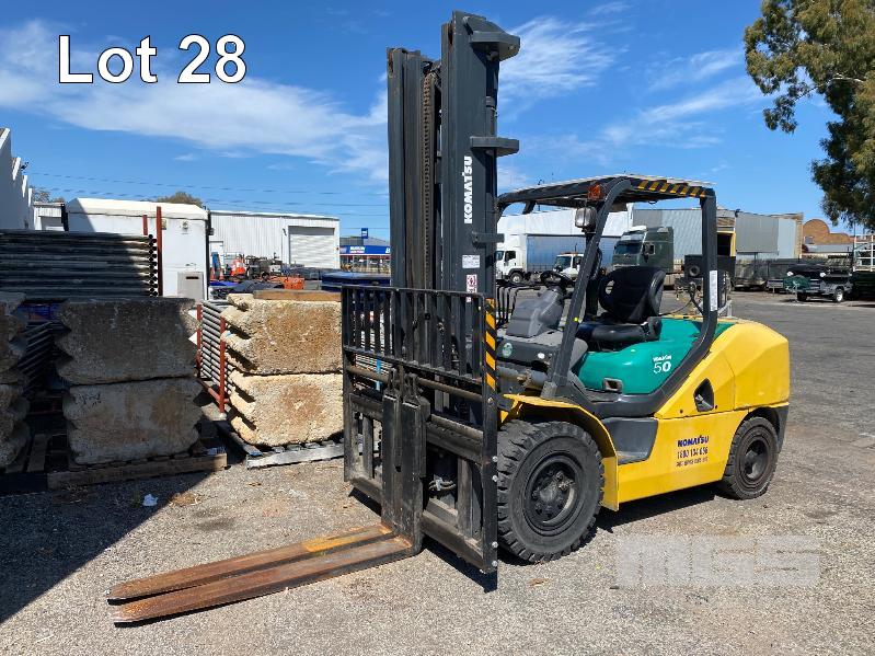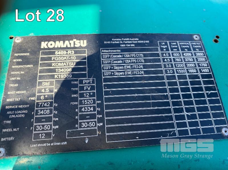 2009 KOMATSU FORKLIFT 4.2T CAP. MOD: FG50AT-10 S/NO: 134096 REGO NO: S60SSI 6 CYLINDER NISSAN PETROL/LPG ENGINE HOURS: 3138 SHOWING MAX LIFT HEIGHT: 4,500mm MAX LIFT WEIGHT 4200kg 2 STAGE MAST WITH SIDESHIFT & TYNE SHIFT SOILD TYRES, RUNS WELL NEW STARTER MOTOR FITTED KEY #52