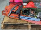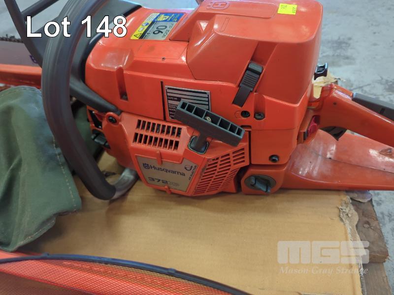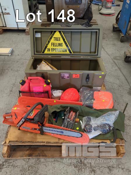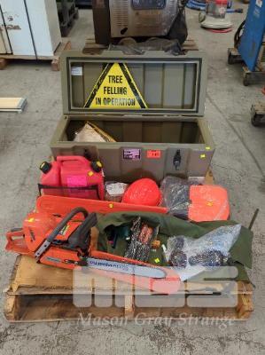 CHAINSAW, HUSQVARNA MOD: 372XP PETROL, 2 STROKE FITTED WITH 400mm BAR WITH HUGE ASSORTMENT OF ACCESSORIES INCLUDING NEW 600mm BAR SHARPENING & TOOL KITS TO SUIT, SAFETY GEAR, WEDGES, POLY FUEL CAN & MIL SPEC STORAGE CASE, GREEN POLY, 900 x 400 x 400mm